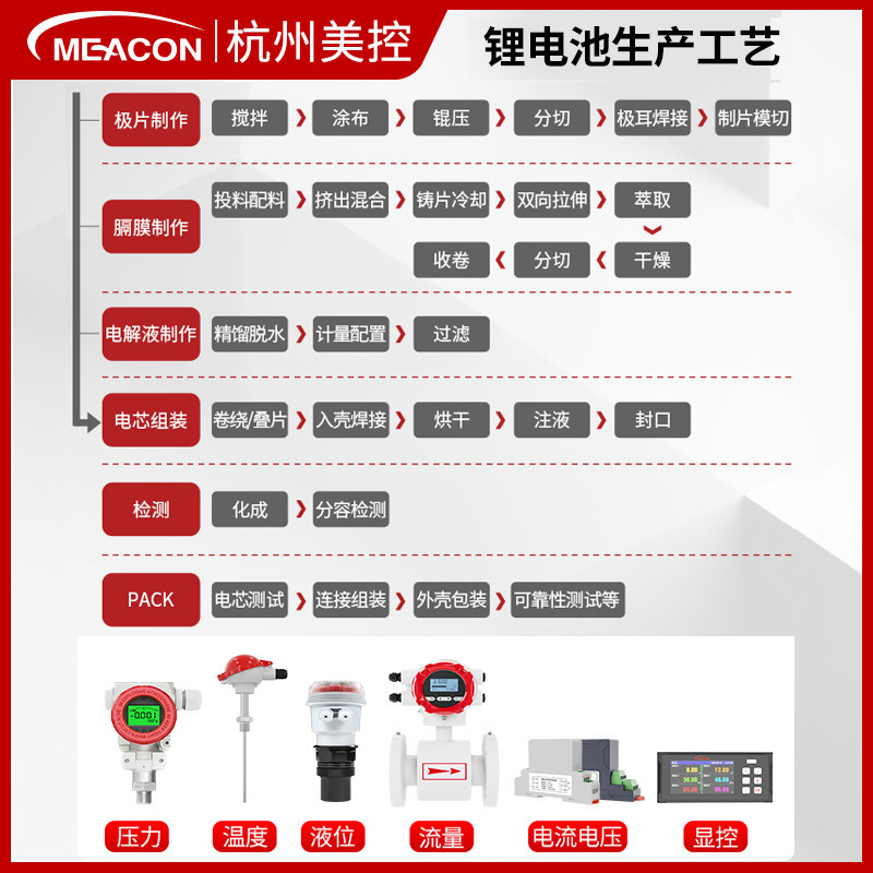 MCACON 杭州美控专注于锂电池行业过程自动化解决方案,产品覆盖极片制作、膜片制作和电解液制作等核心工艺环节。采用高性能MCON系列控制系统,支持精确pH监测(如6.855 pH标准)与过程控制,设备精度达±0.001,外形尺寸紧凑(18.14mm),适用于高要求的锂电池制造环境,提升生产效率与产品质量。
