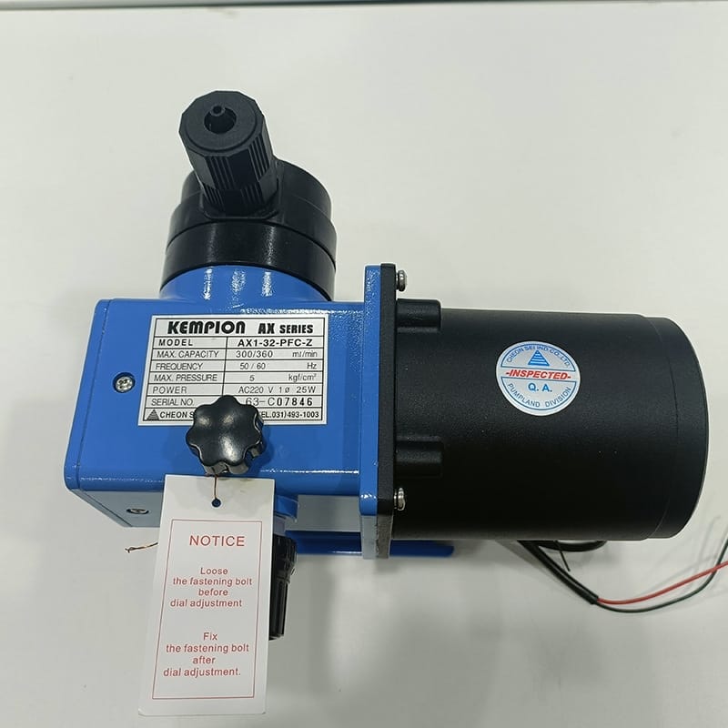 千世(Cheonsei)AX系列小型计量泵是一款高可靠性、高精度的液体加药设备,广泛应用于环保水处理、钢铁、电镀、印刷电路板、造纸、石油化工及助磨剂等工业领域。该系列泵具有手动调节流量功能,控制精准,操作简便。 主要参数: - 流量范围:2.4-62.4升/小时(根据型号不同) - 最大压力:3-15Bar(依型号而定) - 电压:AC 220V,频率50/60Hz - 电机功率:0.025-0.04KW(25-40W) - 连接方式:可选PVC/PTFE软管或法兰连接(DN15) - 泵头材质可选:GFPP、PVDF、STS304、STS316等 - 阀球/阀座材质多样,适应不同化学介质 - 支持单、双、三泵头配置 AX系列采用全密封自冷式或罩极电机设计,确保运行稳定,防护等级高。标准配置包括排气阀(部分型号),锅炉型可选耐高温止回阀,适用于高温工况。产品具备良好的耐腐蚀性和长期运行稳定性,是工业自动化加药系统的理想选择。