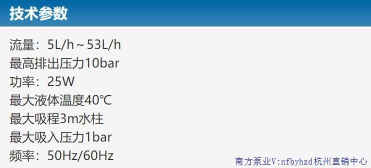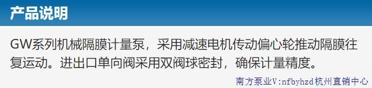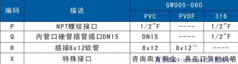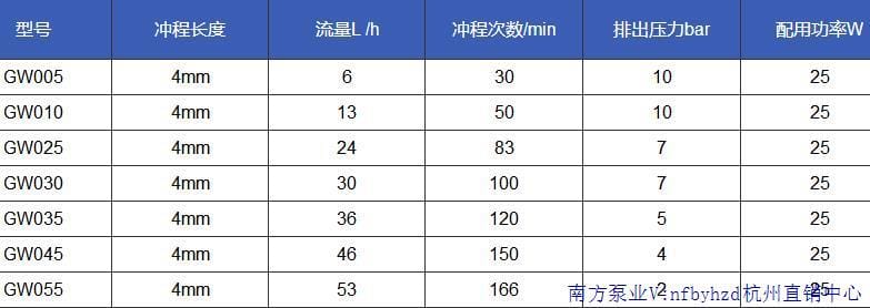 南方泵业股份有限公司(股票代码:300145)成立于1991年,是国内最早研发并规模化生产不锈钢冲压焊接离心泵的企业,也是该领域产销量最大的专业制造商。公司产品广泛应用于增压、工业供水、空调循环、消防系统、污水处理、化工及海水淡化等领域,并远销海外市场。 本产品为南方泵业GW系列机械隔膜计量泵,采用减速电机驱动偏心轮推动隔膜往复运动,实现精确输送。进出口单向阀采用双阀球密封设计,有效保障计量精度。液力端提供PVC、PVDF、316等多种材质选择,适应不同介质输送需求。 性能特点: - 计量精度稳定,误差≤±2%(调节范围10%-100%); - 可在运行或停机状态下无级调节流量; - 结构紧凑,节省安装空间; - 操作简便,经济实用; - 流量范围:5L/h~53L/h,最高排出压力10bar; - 适用介质温度最高40℃,最大吸程3m水柱。 典型应用领域:污水废水处理、石油化工、电力电厂、天然气、制药、造纸、食品加工、实验室等。 型号参数概览: | 型号 | 冲程长度 | 流量(L/h) | 冲程次数(次/min) | 排出压力(bar) | 功率(W) | |--------|----------|------------|------------------|----------------|---------| | GW005 | 4mm | 6 | 30 | 10 | 25 | | GW010 | 4mm | 13 | 50 | 10 | 25 | | GW025 | 4mm | 24 | 83 | 7 | 25 | | GW030 | 4mm | 30 | 100 | 7 | 25 | | GW035 | 4mm | 36 | 120 | 5 | 25 | | GW045 | 4mm | 46 | 150 | 4 | 25 | | GW055 | 4mm | 53 | 166 | 待定 | 25 | 接口配置选项: - P:NPT螺纹接口(1/2"F) - Q:硬管插口(DN15 或 1/2"F) - R:软管插接(8x12) - X:特殊接口(可定制,详询杭州直销中心) 材质选择:PVC、PVDF、316不锈钢,满足不同腐蚀性介质输送需求。 南方泵业杭州直销中心为您提供原厂正品保障与专业技术支持。