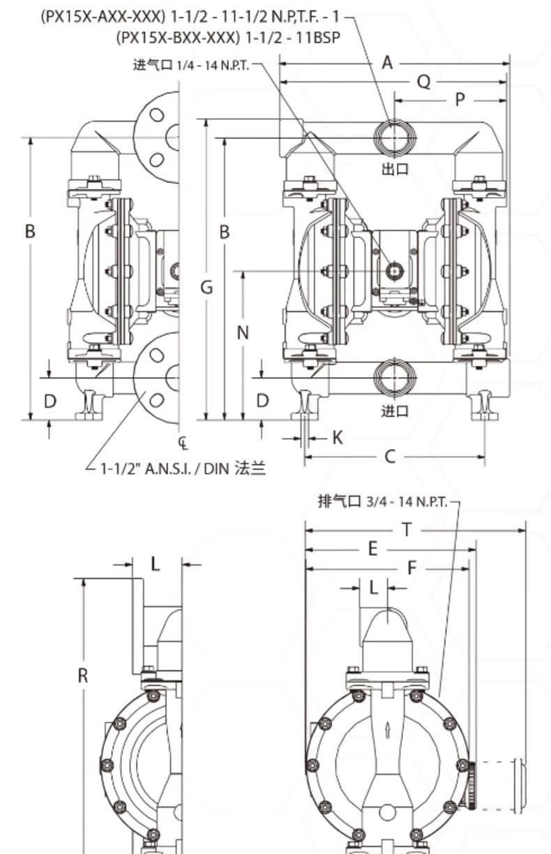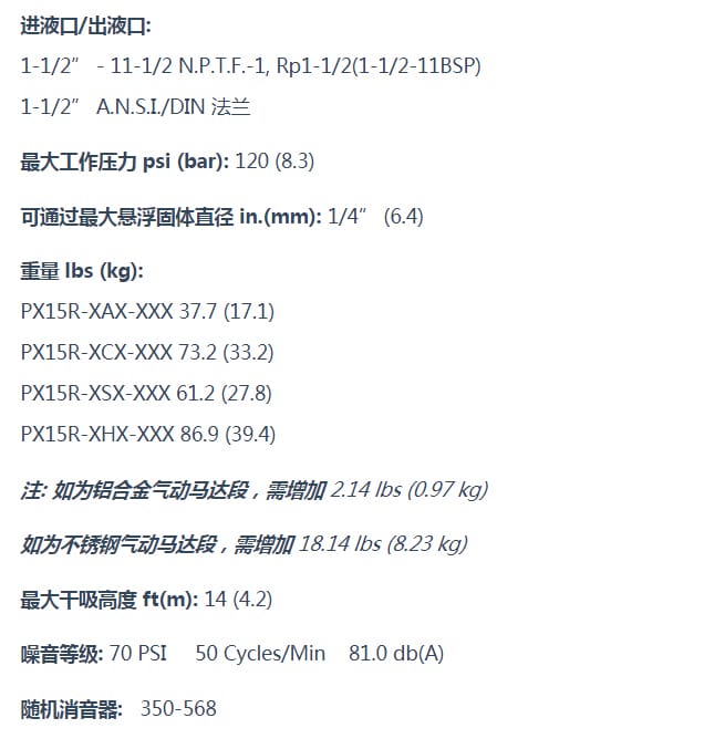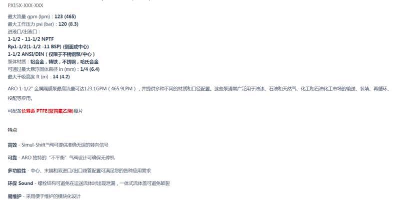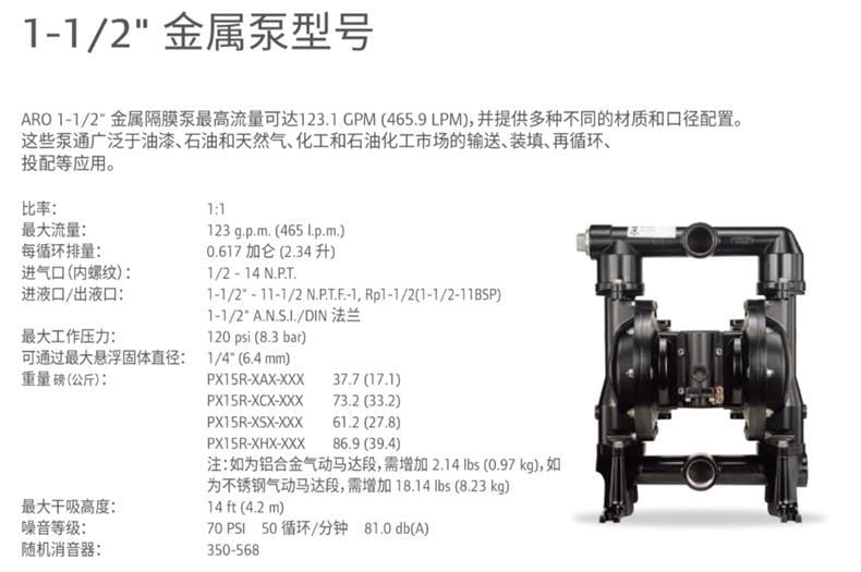 ARO 1-1/2"金属隔膜泵(型号PX15系列)最高流量可达123.1 GPM(465.9 LPM),最大工作压力为120 psi(8.3 bar),广泛应用于油漆、石油和天然气、化工及石油化工领域的输送、装填、再循环和投配等场景。该泵提供多种材质选择,包括铝合金、铸铁、不锈钢和哈氏合金,进液口/出液口支持1-1/2" NPTF、BSP螺纹及ANSI/DIN法兰连接,可通过最大悬浮固体直径达6.4mm(1/4")。 产品特点: - 高效:搭载Simul-Shift阀,确保精准换向; - 可靠:采用ARO独有的不平衡气阀设计,运行稳定,无停机风险; - 多功能性:支持中心、末端及双进出口歧管配置,适应多样化应用需求; - 环保防漏:螺栓式结构与一体式流体盖设计,有效防止泄漏和破裂; - 易于维护:模块化设计,便于拆卸与保养。 可选配长寿命PTFE膜片,提升耐腐蚀性能。最大干吸高度达14英尺(4.2米),噪音低至81.0 dB(A)(70 PSI工况下),并可加装消音器优化运行环境。适用于严苛工业环境,是高性能气动隔膜泵的理想选择。