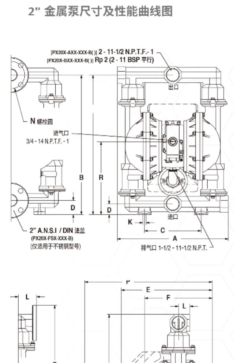 英格索兰Ingersoll Rand ARO EXP 2"金属隔膜泵(型号PX20系列)是一款高性能气动隔膜泵,最大流量可达651升/分钟(172 GPM),适用于陶瓷、油漆、石油天然气、化工及石化等行业中的输送、装填、再循环和投配应用。该泵采用1:1气液比率设计,最大工作压力为120 psi(8.3 bar),可通过最大直径为6.4mm的悬浮固体,干吸高度最高达4.2米。 提供多种材质选择,包括铝合金(AL)、铸铁(CI)、哈氏合金(H)和不锈钢(SS),接口类型涵盖NPTF螺纹、BSP螺纹及2" ANSI/DIN法兰连接,满足不同工况需求。泵体重量根据材质配置在41.5kg至89.9kg之间,具备良好的耐用性与适应性。 支持电子接口版本(PE20系列),可选电磁阀电压规格(如12VDC、24VDC、120VAC等)及行程末端反馈、泄漏检测等功能模块,符合ATEX/IECex/NEC/CEC防爆认证要求。配备消音器组件,运行噪音低至85 dB(A),提升操作环境舒适度。 本产品由厂家直销,支持加工定制,货源充足,快速发货,提供一年质保,是工业流体输送领域的理想选择。