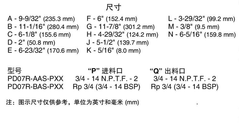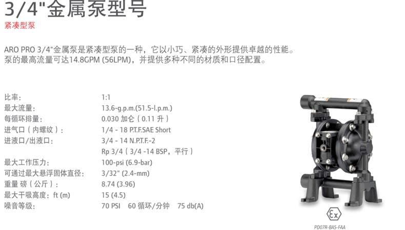 ARO PRO 3/4"金属隔膜泵是高性能的紧凑型气动隔膜泵,具备卓越的输送能力与灵活的配置选项。该泵最大流量可达13.6 GPM(51.5 LPM),每循环排量为0.030加仑(0.11升),适用于广泛工业应用。采用1:1气液比设计,最大工作压力为100 psi(6.9 bar),可处理最大直径2.4mm的悬浮固体,干吸高度最高达4.5米。进气口为1/4" PT.FSAE Short,进出口口径为3/4" NPT或BSP平行螺纹,方便连接。泵体重量仅3.96公斤,结构紧凑,便于安装与维护。提供多种中心体、过流部件、阀座、球阀和隔膜材料组合,支持远程控制模块选配(如电磁阀、行程反馈、泄漏检测等),满足不同工况需求。适用于化工、水处理、制药、食品等多个行业领域。