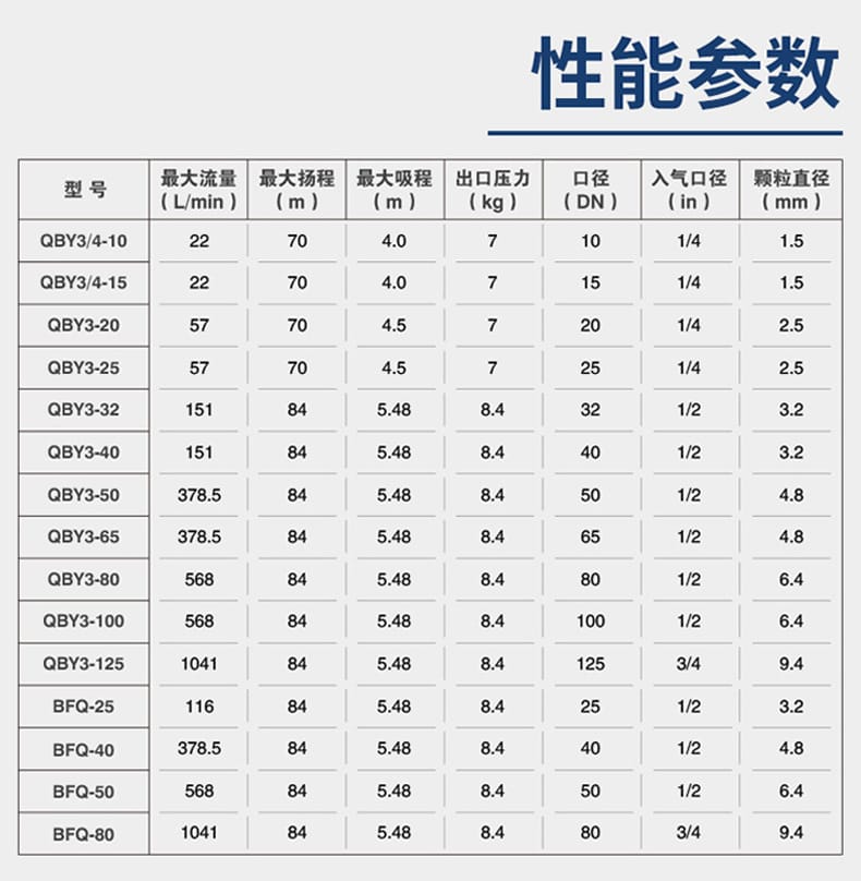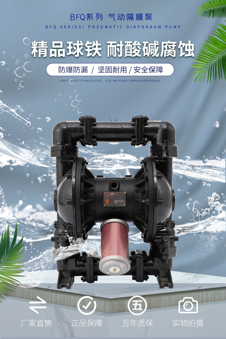 边锋机械集团源自1990年,拥有33年制泵经验,坐落于27000m²的智能制造园区,专注隔膜泵、卫生泵、自吸泵、磁力泵等流体设备的研发与制造。公司通过ISO9001质量管理体系、欧盟CE、浙江制造、防爆合格证等多项权威认证,拥有120+项专利技术,服务网点覆盖全国30多个省市。 作为隔膜泵领域的专家,边锋机械推出的BFQ系列气动隔膜泵采用精品球铁或不锈钢材质,具备大流量、大压力、耐酸碱、抗腐蚀、低噪音、可空打不死机等八大优势。标配金属消声器,有效降噪并延长使用寿命,适用于高要求工业环境。 产品提供五大材质选择:不锈钢、工程塑料、氟塑料、铝合金、球墨铸铁,满足不同介质输送需求。具备安全防爆、可空运转、免润滑、无泄漏等四大防护特性,广泛服务于中粮、徐工、中国石油、国药集团、比亚迪等世界500强企业。 BFQ系列型号齐全,口径从DN15到DN125,最大流量可达1041L/min,扬程高达84米,支持颗粒直径达9.4mm,适配多种复杂工况。工厂直销,现货供应,支持国内外发货,提供五年质保与专业技术支持,是工业流体输送的可靠之选。