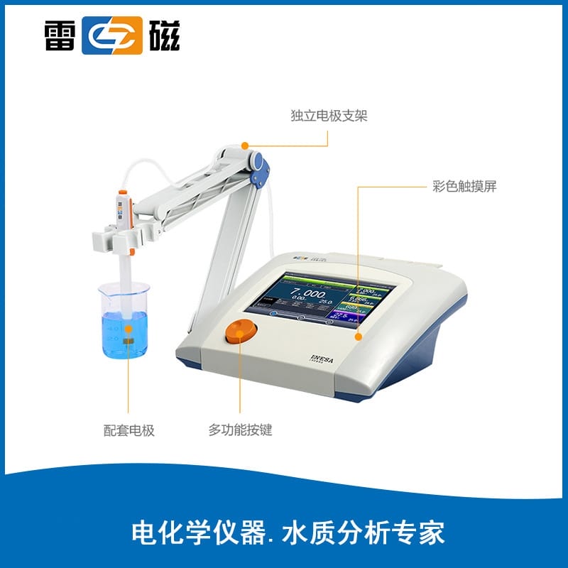 雷磁DZS-708L型多参数水质分析仪是一款高性能实验室仪器,支持pH/pX、离子浓度、mV、电导率、电阻率、TDS、盐度、溶解氧、溶解氧饱和度及温度等多参数测量。仪器配备7吋彩色触摸屏,采用中文或英文操作系统,操作界面导航式设计,使用直观便捷。 该仪器支持pH/pX、电导和溶解氧三大测量模块任意组合,最多可兼容4个模块,实现即插即用。具备智能终点判断、自动温度补偿、自动校准、标准溶液自动识别功能,并内置多种离子模式(如H⁺、Na⁺、F⁻、NO₃⁻等),支持用户自建离子模式及多种测量方法(直读浓度、标准添加法、GRAN法等)。 电导模块支持智能变频技术,一支电极即可覆盖0-200ms/cm常用测量范围,同时支持纯水补偿和海水盐度补偿。溶解氧模块具备自动零氧与满度标定、大气压自动补偿功能。 符合GLP规范,支持存储1000组测量数据,具备用户ID与密码管理、方法管理、电极管理等功能,支持连接电脑、打印机及U盘,实现数据传输、打印与备份。标配雷磁专用电极及数据采集软件,广泛应用于环境监测、科研实验、水质分析等领域。
