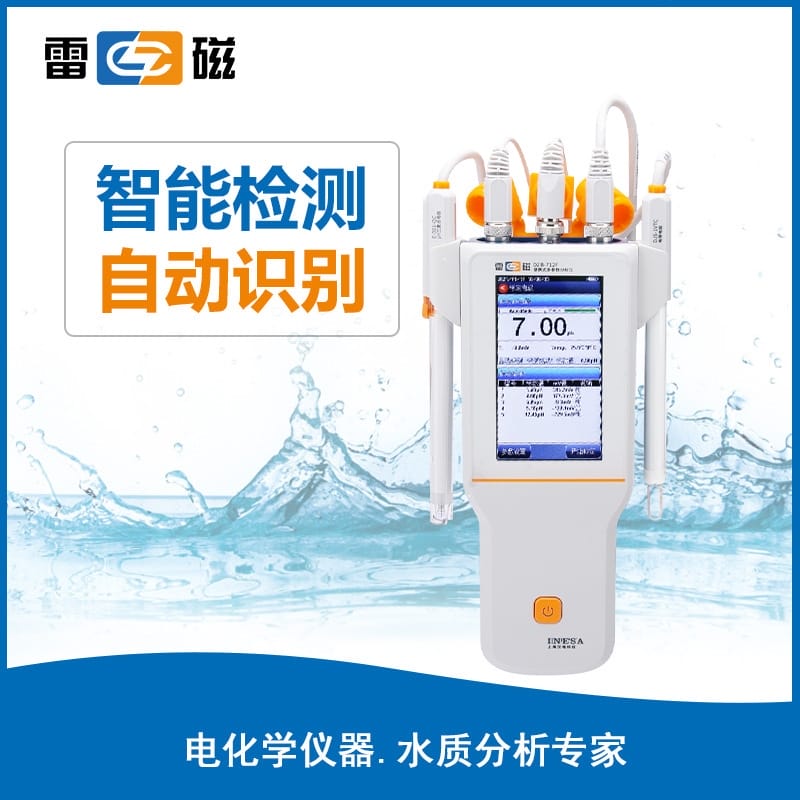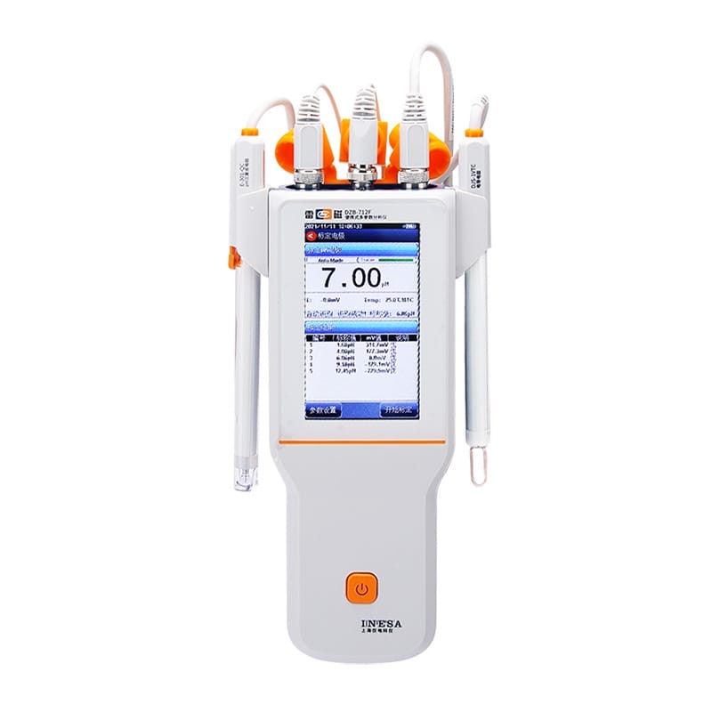 DZB-712F型便携式多参数分析仪是一款集pH/pX、电导率、溶解氧、离子浓度、mV、TDS、盐度及温度测量于一体的高性能水质分析设备。仪器具备0.01级pH测量精度和1.0级电导率精度,满足实验室与现场检测的双重需求。 该分析仪内置三大测量单元,支持全面水质参数检测,配备高清彩色液晶触摸屏,支持中英文界面切换,操作直观便捷。具备智能终点判断功能,支持自动读数、定时读数及手动读数模式,并可实现自动温度补偿、大气压补偿和盐度补偿,提升测量准确性。 DZB-712F支持GB、DIN、NIST等多种标准缓冲液自动识别,支持1-5点pH和离子电极标定,单位灵活切换(mol/L、mg/L、ug/L等),并提供多种测量方法,包括标准添加法、样品添加法和GRAN法。电导测量支持自动量程切换与频率调节,适配不同水质条件。 仪器符合GLP规范,可存储各1000组数据,支持USB数据传输、RS232打印输出,配备蓝牙功能(部分型号),便于数据管理与追溯。整机达到IP65防护等级,标配便携手提箱、电极套装及校准溶液,适用于环保、水务、工业过程控制等野外与现场应用场景。 核心配置包含E-301-QC pH三复合电极、DJS-1VTC铂黑电导电极、DO-958-Q溶解氧电极,配合Micro USB接口实现充电、通信与打印一体化连接,续航持久,支持移动电源充电,是高可靠性、多功能集成的便携式水质分析解决方案。