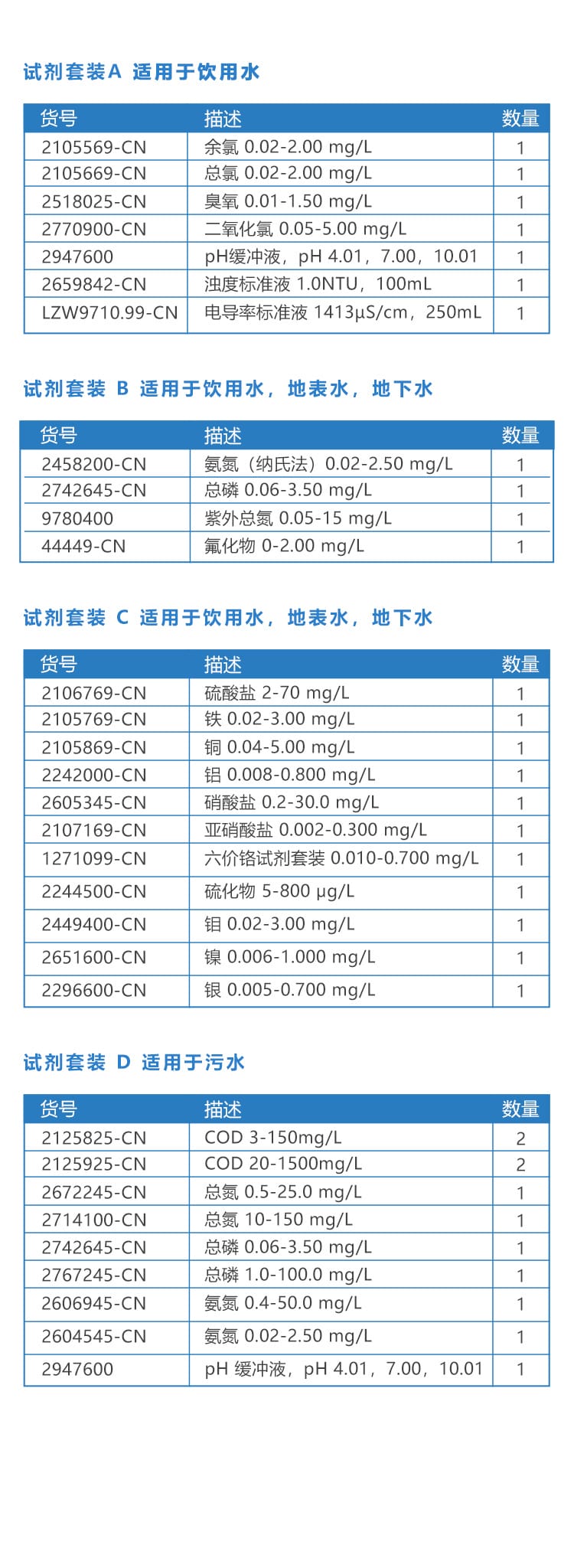 - **试剂套装A**:专为饮用水设计,包含余氯、总氯、臭氧、二氧化氯检测试剂,以及pH缓冲液、浊度标准液和电导率标准液,确保基础水质指标准确测量。