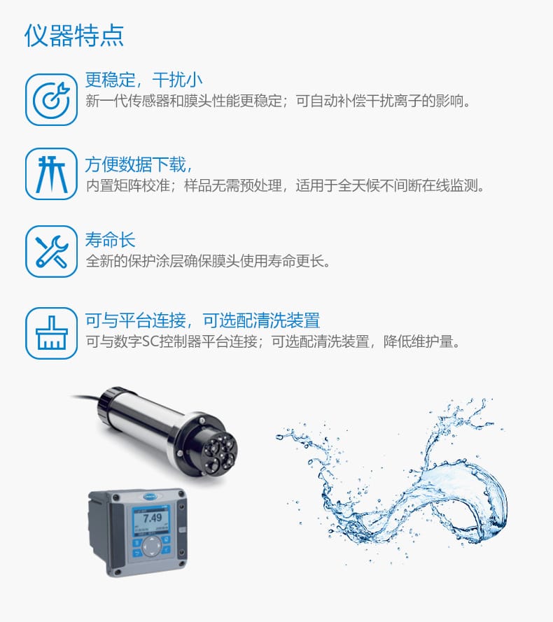 设备内置矩阵校准系统,样品无需预处理,支持全天候连续在线监测。创新的保护涂层延长了膜头使用寿命,降低更换频率和运维成本。支持与哈希SC数字控制器平台无缝连接,并可选配自动清洗装置,进一步减少人工干预。