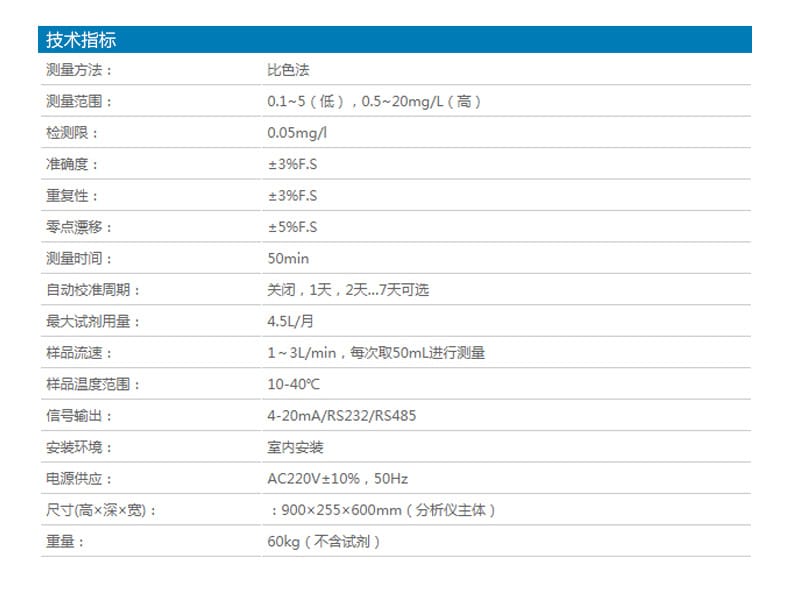 仪器采用比色法测量,测量范围为0.1~5mg/L(低量程)和0.5~20mg/L(高量程),检测限达0.05mg/L,准确度与重复性均为±3%F.S,确保测量结果精准可靠。支持自动校准与自动量程切换,配备自动反冲洗样品过滤器,每次检测后自动清洗,提升测量精度并减少人工干预。