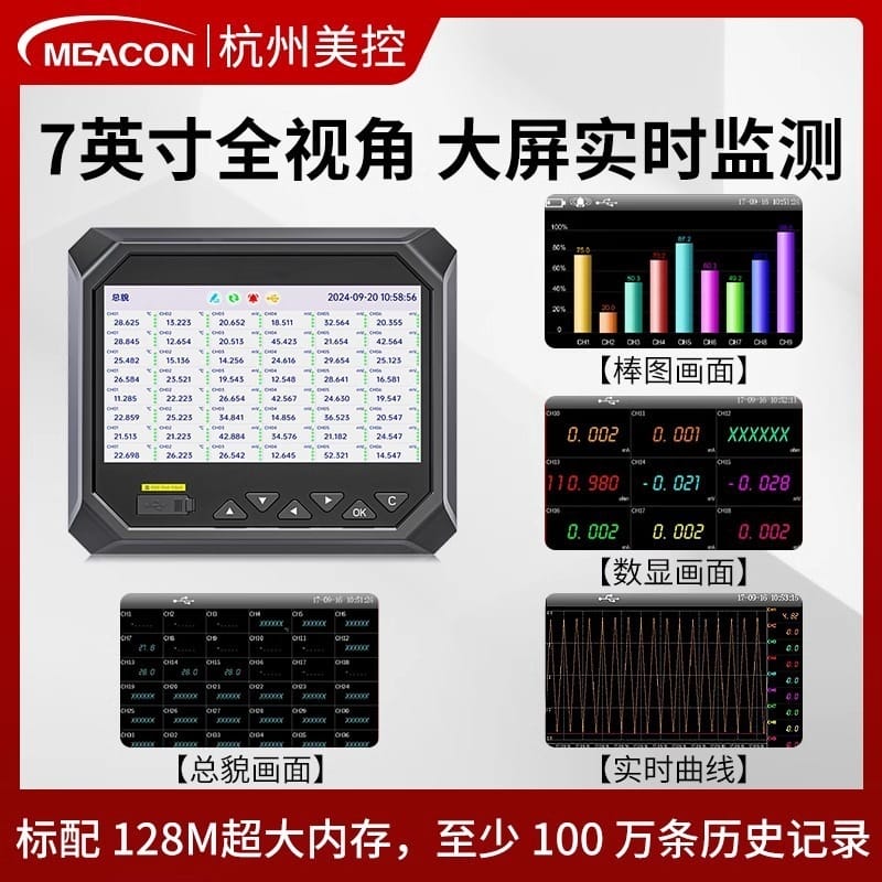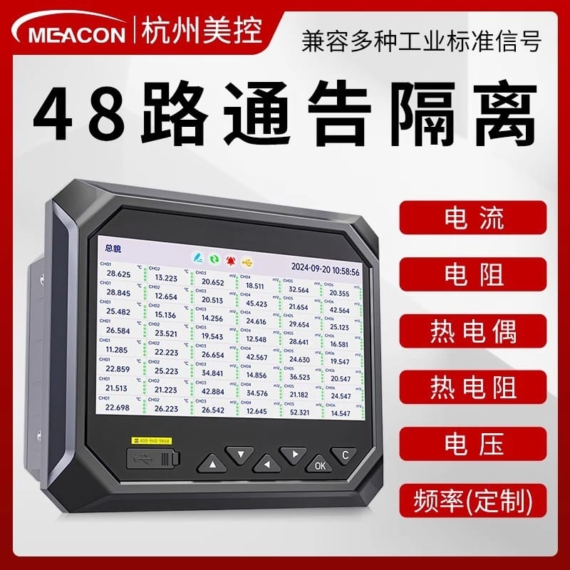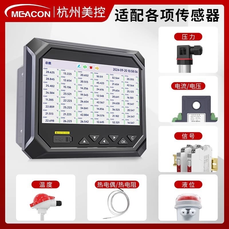 杭州美控(MEACON)工业级无纸记录仪是一款高性能、多功能的数据采集与监控设备。产品配备7英寸全视角LED背光显示屏,支持数值、曲线、棒图多种显示模式,实时清晰展示各类工业参数。具备48路信号输入通道,兼容电流、电压、热电偶、热电阻、压力、液位、流量等多种工业标准信号,适配广泛传感器类型。内置128M超大内存,可存储超过100万条历史数据,支持USB导出与RS-485、以太网通讯,便于系统集成与远程监控。产品采用ABS材质外壳与散热口设计,运行稳定可靠,适用于电力、建材、制药、食品、工业水处理等多个行业。通过ISO、CE、SGS等多项国际认证,符合国家标准,广泛服务于霍尼韦尔、长安汽车、可口可乐、农夫山泉、中国航天等知名企业,累计服务超70万用户,全国设有30+技术服务中心,提供专业选型与售后支持。