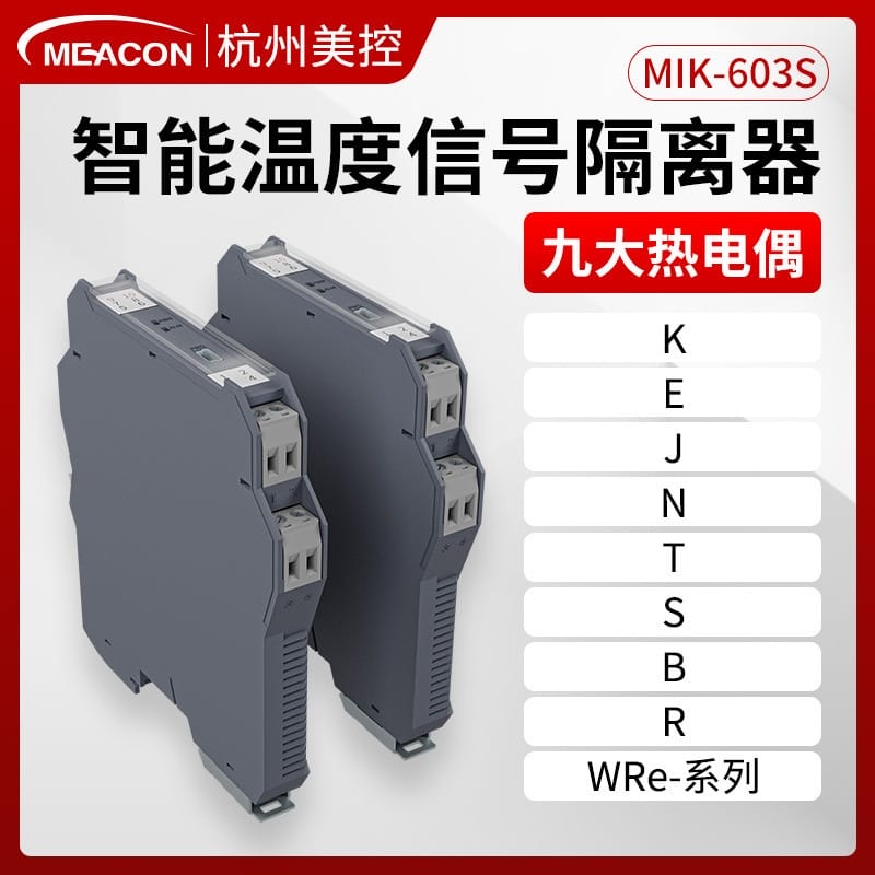 • MEACON美控MIK-603S温度隔离器是一款高性能信号隔离转换设备,兼容K、E、S、B、J、T、R、N及WRe系列等多种热电偶和Pt100、Cu50、Cu100等二/三线制热电阻信号输入。产品采用一体式封装隔离变压器,实现输入、输出与电源三端隔离,显著提升抗干扰能力。响应时间小于0.5秒,支持4-20mA或0-10V等多种输出信号类型,负载能力强,测量准确度高。内置冷端温度补偿端子,补偿范围-20℃~+60℃,有效提高热电偶测温精度。工作环境宽温设计(-20℃~+60℃),支持18-32VDC供电,广泛应用于工业自动化、过程控制等领域。支持现场编程,安装便捷,品质可靠,提供终身维护、30天退换货及全国包邮服务,助力高效稳定运行。