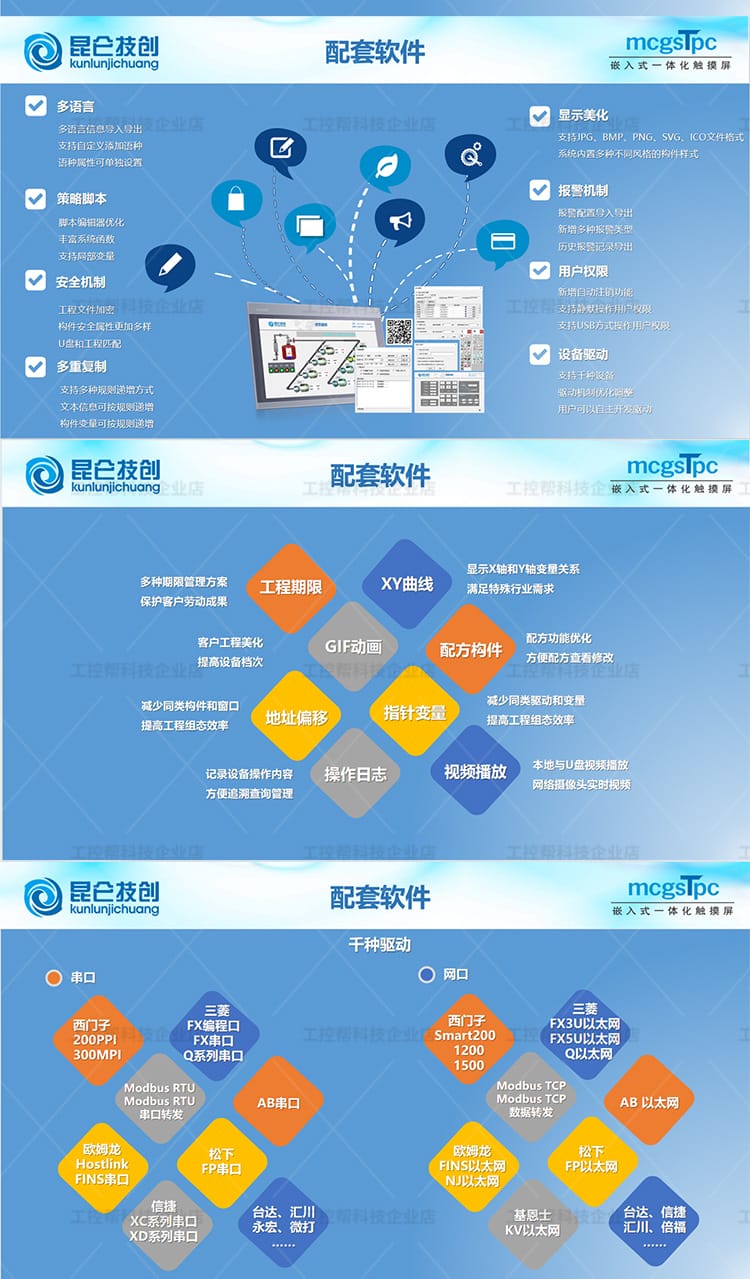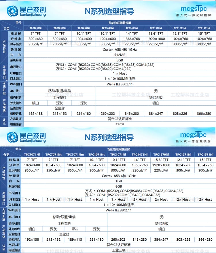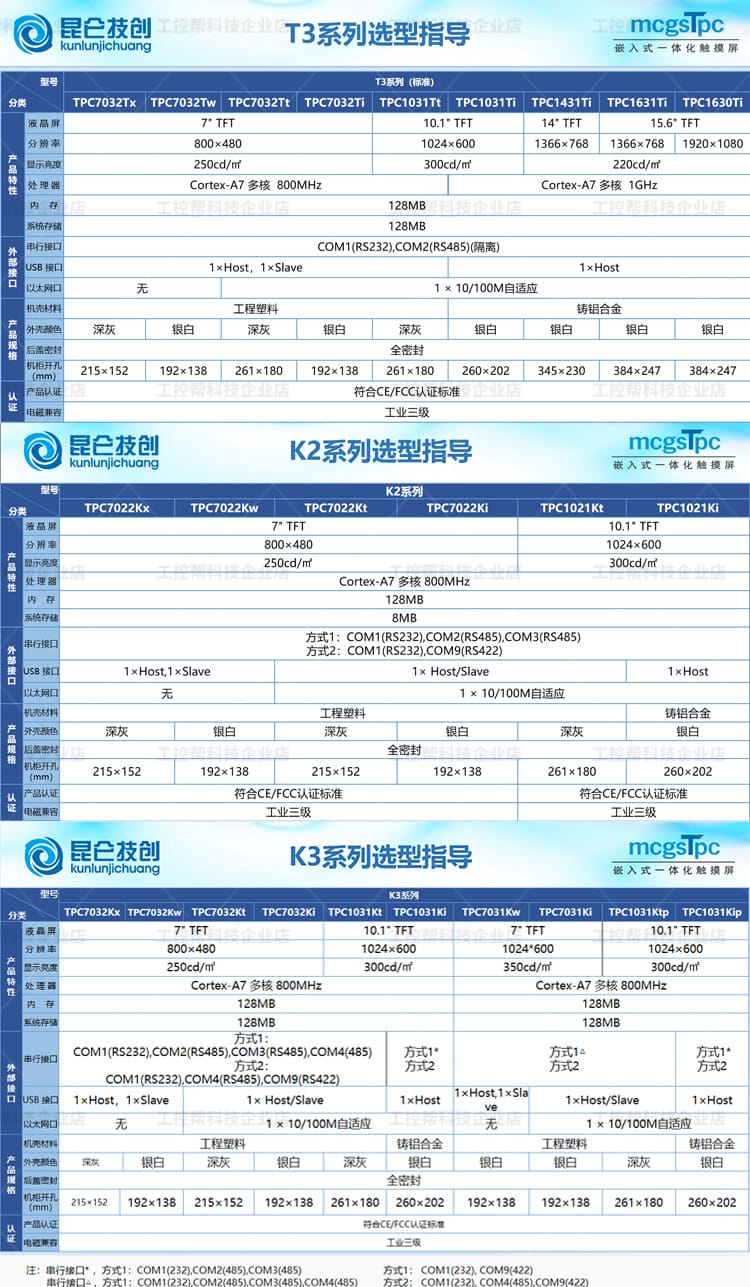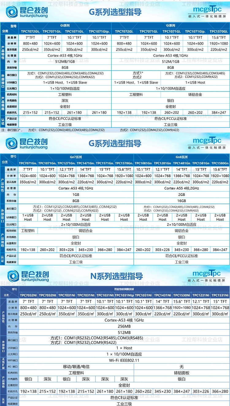 昆仑技创(kunlunjichuang)推出的MCGS TPC系列触摸屏是新一代基于Linux系统的嵌入式一体化人机界面设备,广泛应用于工业自动化控制领域。产品涵盖E系列、T系列、K系列、G系列和N系列,具备经济实惠、接口丰富、高分辨率、工业级防护等特点。 各系列产品覆盖4.3英寸至15.6英寸多种屏幕尺寸,采用TFT液晶显示技术,支持电容触摸,具备良好的显示亮度与稳定性。核心配置包括ARM处理器或Cortex-A7多核平台,配备64MB/128MB内存及8MB存储空间,满足不同层级应用需求。 接口方面,提供串行通信(RS232/RS485)、USB Host/Slave、部分型号支持10/100M以太网口,满足多样化设备连接需求。外壳采用工程塑料材质,具备全密封设计,通过CE/FCC认证,符合工业三级电磁兼容标准,确保在复杂工业环境中稳定运行。 该系列广泛适用于PLC控制系统、智能制造、自动化产线等人机交互场景,是性价比高、性能可靠的工控触摸屏解决方案。