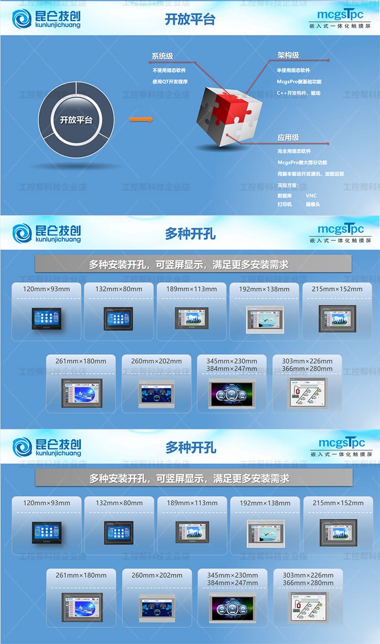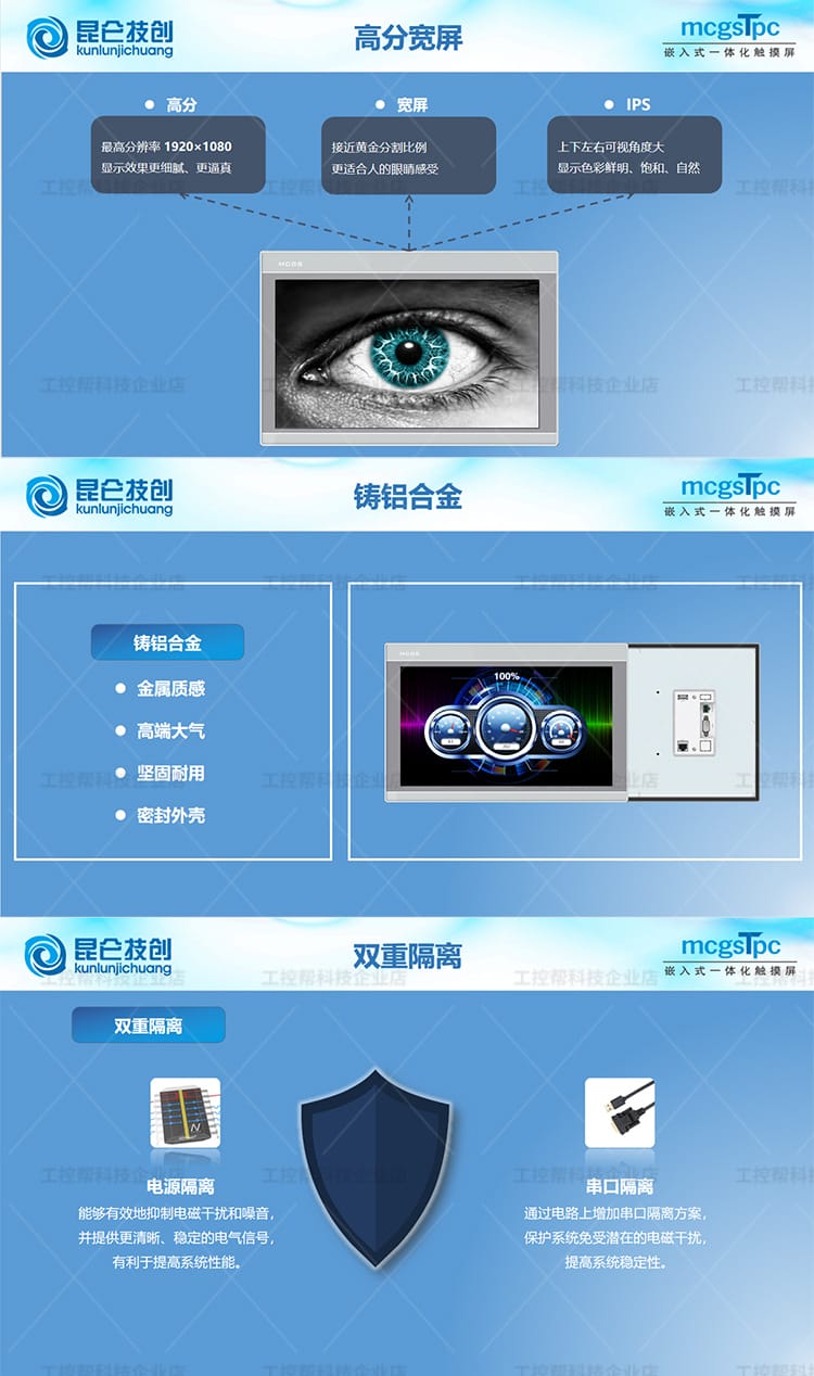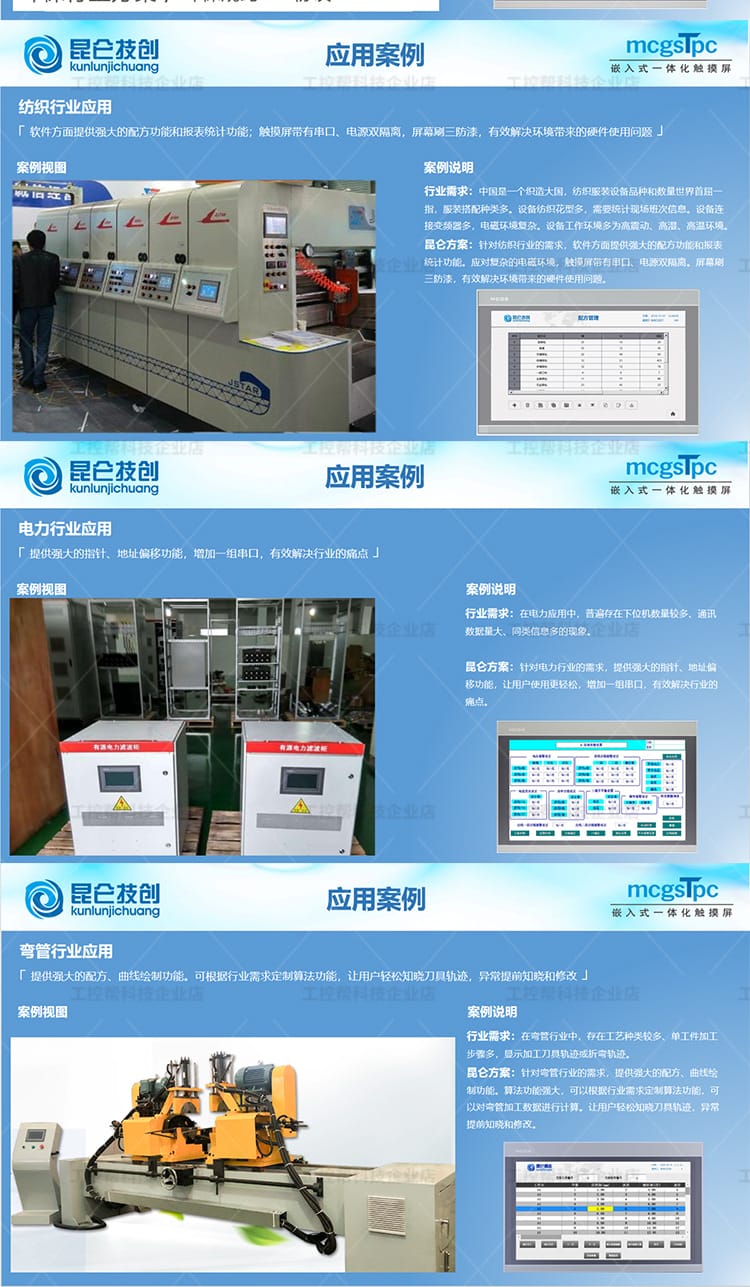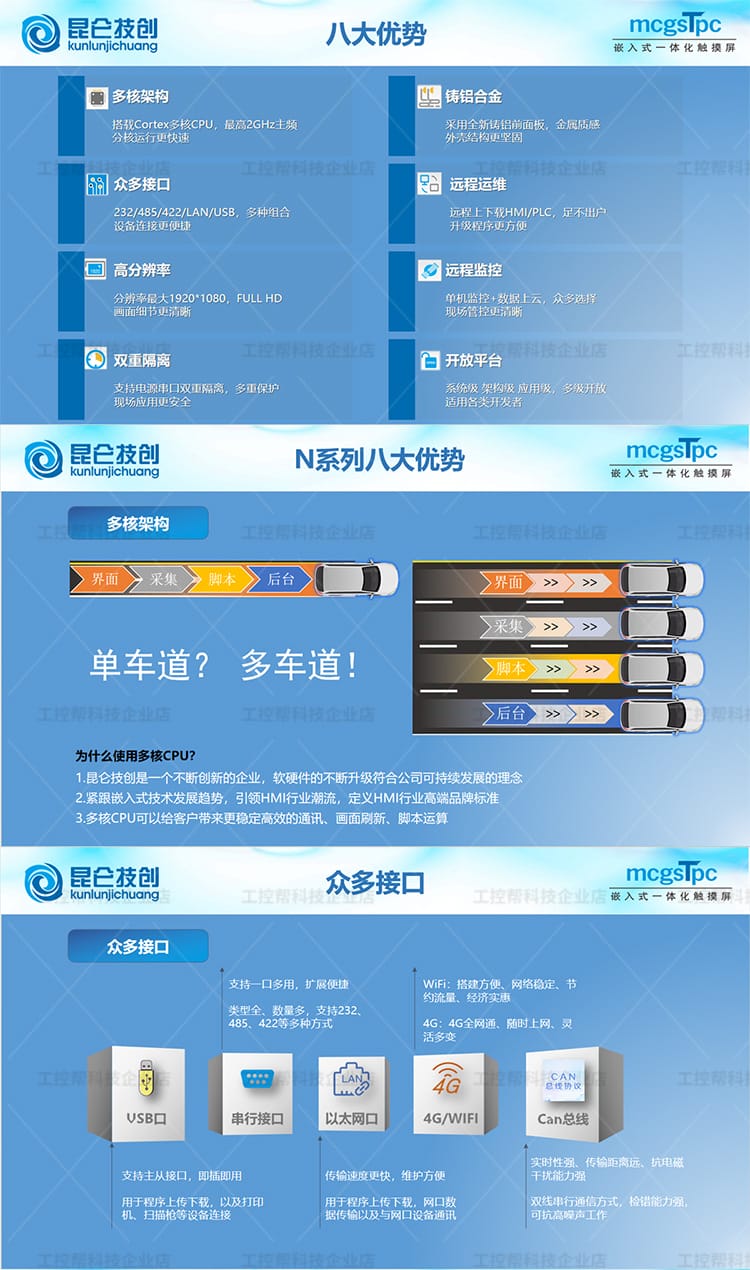 昆仑技创(kunlunjichuang)推出的MCGS TPC系列触摸屏是新一代基于Linux系统的嵌入式一体化人机界面设备,广泛应用于工业自动化控制领域。产品涵盖E系列、T系列、K系列、G系列和N系列,具备经济实惠、接口丰富、高分辨率、工业级防护等特点。 各系列产品覆盖4.3英寸至15.6英寸多种屏幕尺寸,采用TFT液晶显示技术,支持电容触摸,具备良好的显示亮度与稳定性。核心配置包括ARM处理器或Cortex-A7多核平台,配备64MB/128MB内存及8MB存储空间,满足不同层级应用需求。 接口方面,提供串行通信(RS232/RS485)、USB Host/Slave、部分型号支持10/100M以太网口,满足多样化设备连接需求。外壳采用工程塑料材质,具备全密封设计,通过CE/FCC认证,符合工业三级电磁兼容标准,确保在复杂工业环境中稳定运行。 该系列广泛适用于PLC控制系统、智能制造、自动化产线等人机交互场景,是性价比高、性能可靠的工控触摸屏解决方案。