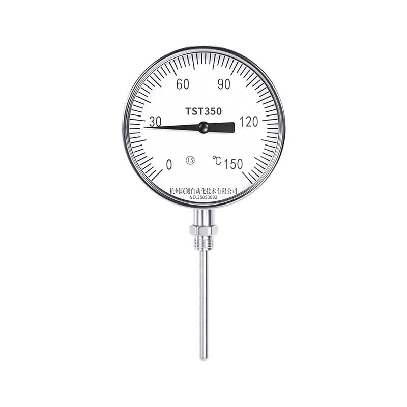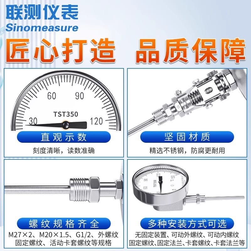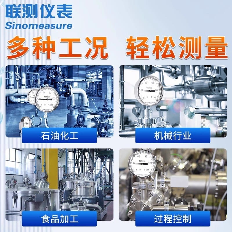 联测仪表(Sinomeasure)TST350系列不锈钢双金属温度计,专为工业过程自动化设计,具备高灵敏度与精准测温性能。产品采用304不锈钢材质,耐腐蚀、抗氧化,适用于气体、液体、蒸汽等多种介质环境。提供径向型、轴向型、万向型三种结构,满足不同管道安装需求(顶部或侧面开孔),表壳公称直径可选60mm、100mm、150mm,显示清晰直观。 标准螺纹接口默认为M20*1.5,支持可动外螺纹、固定螺纹及活动卡套连接方式,适配性强。探杆直径涵盖Φ6mm至Φ16mm,部分规格配备可拆卸护套,便于维护与更换。精度等级达1.5级,确保现场测量稳定可靠。 广泛应用于石油化工、机械制造、食品加工、锅炉测温、冷却水循环等场景。联测仪表拥有ISO9001认证、欧盟CE认证及瑞士SGS深度验厂资质,年产能超30万套,产品远销130多个国家和地区,品质值得信赖。