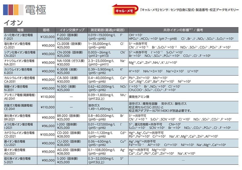 本系列产品为高精度离子选择性复合电极,涵盖氟化物(F-)、氯化物(Cl-)、氰化物(CN-)、钠(Na+)、钾(K+)、钙(Ca2+)、硝酸根(NO3-)、氨氮(NH4+)、溶解氧(DO)、臭溴(Br-)、碘(I-)、镉(Cd2+)、铜(Cu2+)、银(Ag+)和硫化物(S2-)等多种离子检测。每款电极均具备明确的测定范围和最优pH区间,并标注了共存离子干扰情况,确保测量准确性。部分电极需配合专用校正液使用,适合实验室、工业过程控制及环境监测等领域。