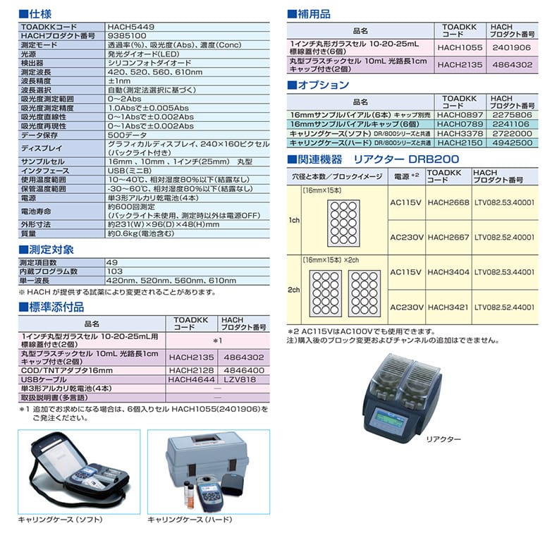 设备采用4节AA电池供电,续航可达约600次测量,适合野外作业。标配包含10mm、16mm及25mm圆形比色皿,兼容多种样品容器,并可通过USB接口连接电脑进行数据导出。配合DRB200消解器使用,可实现COD、总磷、总氮等项目的高效检测。