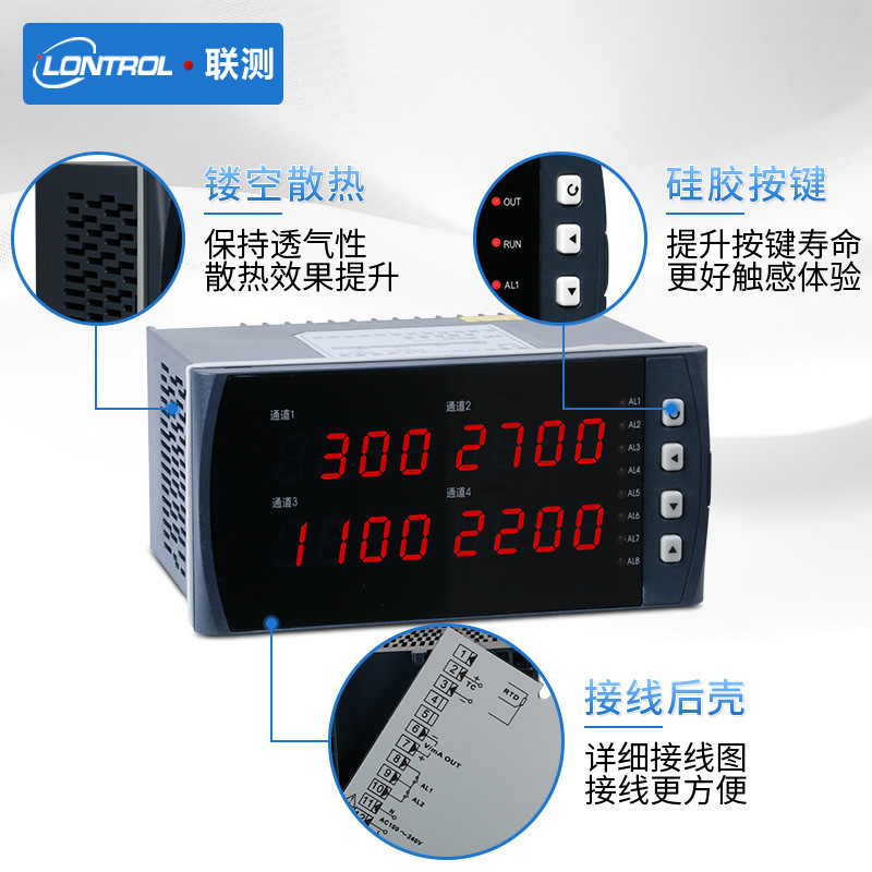 联测LONTROL SIN-2740四回路数显表是一款高性能的多功能数字显示控制器,支持四路独立信号输入,可智能匹配33种传感器类型,广泛应用于温度、压力、液位和电量等工业参数的实时监测与控制。产品具备0.2级测量精度,采用双四位LED显示,清晰直观。支持多种输出功能,包括继电器报警输出、4-20mA/0-10V等变送输出,并配备标准MODBUS RTU协议的RS485通讯接口,便于系统集成。设备采用卡入式安装设计,提供三种外形尺寸选择(横式、竖式、方型),适应不同现场需求。关键部件如硅胶按键、镂空散热结构和阻燃接线保护壳确保产品耐用性与运行稳定性。适用于各类自动化控制系统,是工业过程监控的理想选择。