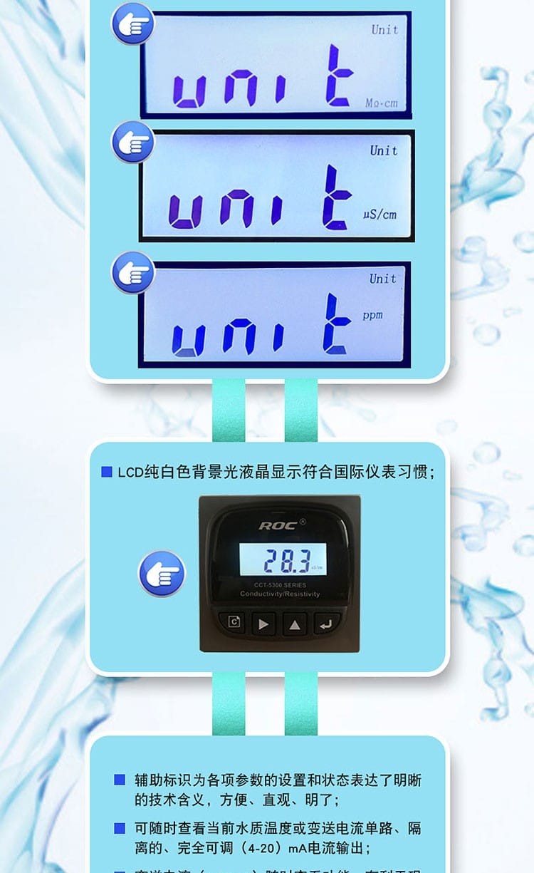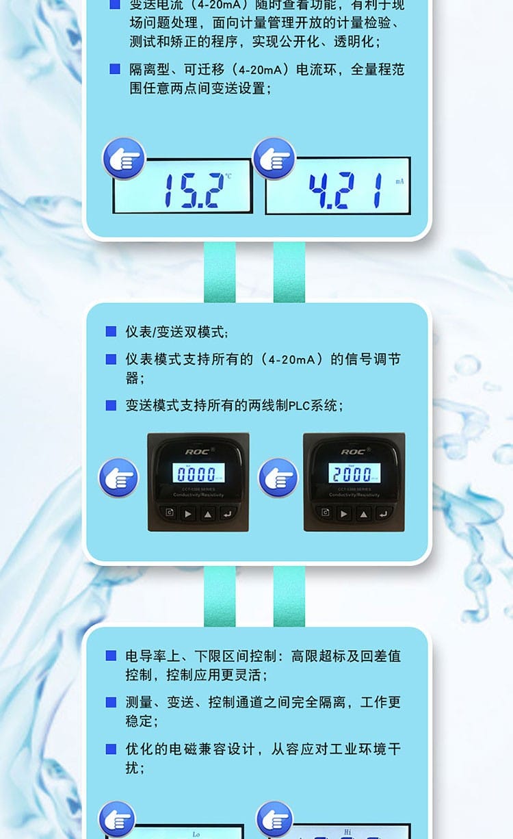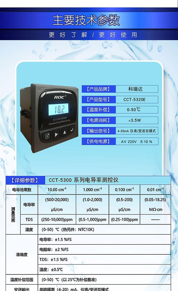 科瑞达(ROC)CCT-5320E182属于CCT-5300系列电导率测控仪,集电导率、电阻率和TDS测量与控制于一体,具备高精度与强抗干扰能力。支持多种电导池常数(10.00至0.01 cm⁻¹),测量范围覆盖(0.05–18.25) MΩ·cm及对应TDS值,温度补偿基于NTC10K热元件,确保在(0–50)℃范围内稳定运行。仪表配备LCD白色背光显示屏,支持4–20 mA隔离变送输出和继电器控制输出,具备上下限报警及回差设定功能。提供仪表/变送双模式,兼容PLC系统,适用于工业净水、食品饮料、医疗及污水处理等场景。采用面板镶嵌安装,外形紧凑(96×96×105 mm),防护等级高,配合专用ROC系列电导池(如ROC182-G卫生级不锈钢型),确保长期稳定精准测量。注意:信号线需单独敷设,禁止加长电缆,避免阳光直射显示屏。