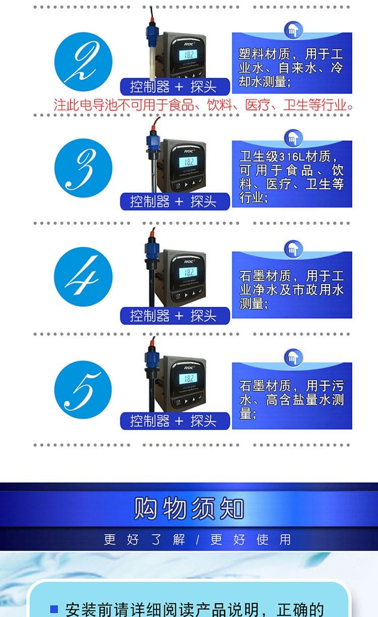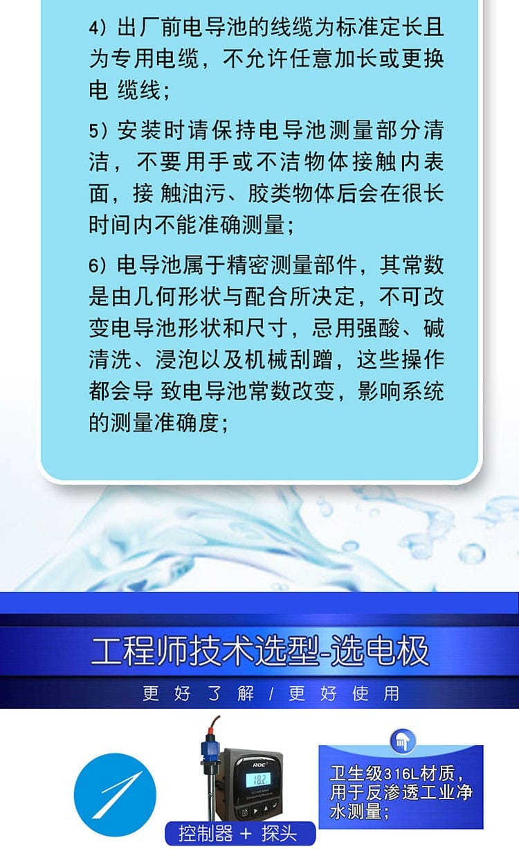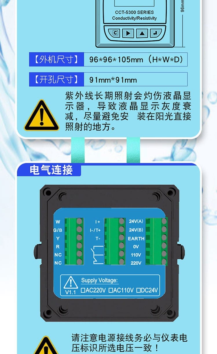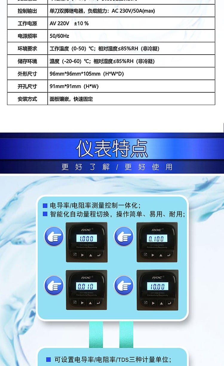 科瑞达(ROC)CCT-5320E182属于CCT-5300系列电导率测控仪,集电导率、电阻率和TDS测量与控制于一体,具备高精度与强抗干扰能力。支持多种电导池常数(10.00至0.01 cm⁻¹),测量范围覆盖(0.05–18.25) MΩ·cm及对应TDS值,温度补偿基于NTC10K热元件,确保在(0–50)℃范围内稳定运行。仪表配备LCD白色背光显示屏,支持4–20 mA隔离变送输出和继电器控制输出,具备上下限报警及回差设定功能。提供仪表/变送双模式,兼容PLC系统,适用于工业净水、食品饮料、医疗及污水处理等场景。采用面板镶嵌安装,外形紧凑(96×96×105 mm),防护等级高,配合专用ROC系列电导池(如ROC182-G卫生级不锈钢型),确保长期稳定精准测量。注意:信号线需单独敷设,禁止加长电缆,避免阳光直射显示屏。
