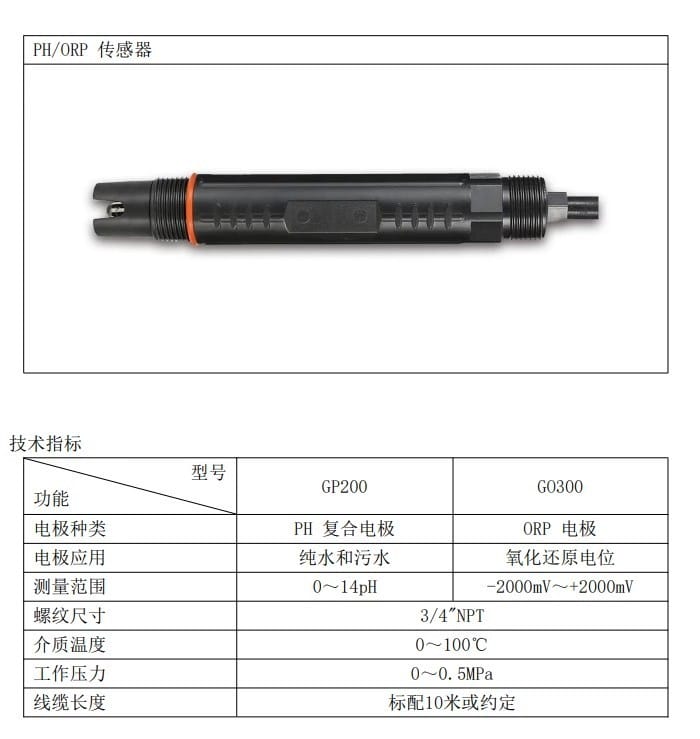 在使用阔思(KUOSI)PH传感器前,需进行以下检查与操作:首先确认球泡是否完好无损,若破损则需更换;检查球泡内部是否充满电解液且无气泡,如有气泡可通过甩动方式排除。使用前应了解传感器的耐温耐压性能:常规型适用温度为0-80°C,高温型可达0-120°C,工作压力均不超过0.6MPa(特殊型号以约定为准)。严禁将传感器水平或倒置安装,推荐采用顶部式、顶部法兰式、流通式、侧壁或15°斜角沉入式安装,确保接口成15度斜角以保障测量准确性。本系列PH/ORP传感器提供GP200(PH复合电极)和G0300(ORP电极)两种型号,适用于纯水、污水及氧化还原电位测量,具备3/4"NPT螺纹接口,支持0~100℃介质温度和0~0.5MPa工作压力,标配10米线缆,满足多种工业场景需求。