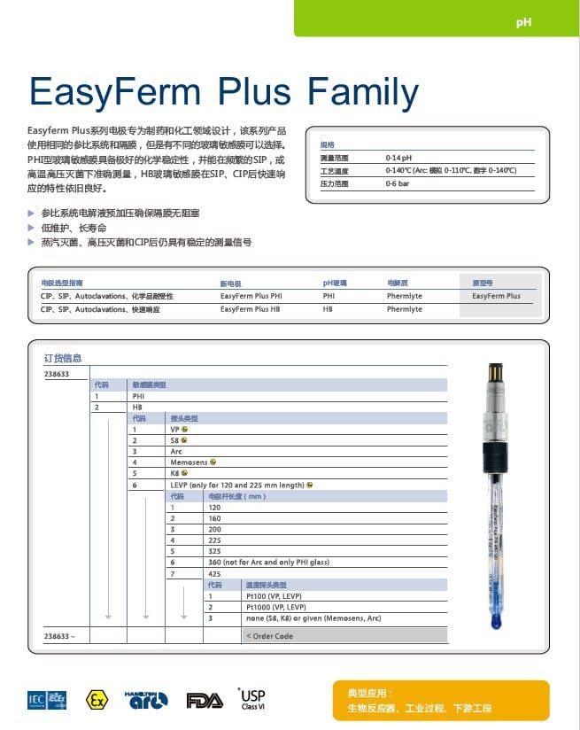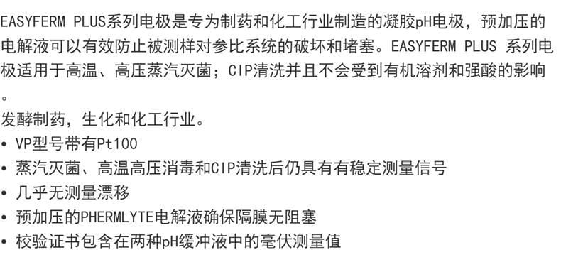 EasyFerm Plus系列pH电极由恩德斯豪斯(E+H)推出,专为制药、生化及化工行业严苛工况设计。该系列电极采用凝胶电解质与预加压参比系统,有效防止样品渗透导致的隔膜堵塞,确保在高温、高压蒸汽灭菌(SIP)、CIP清洗以及强酸、有机溶剂环境中仍保持稳定信号输出。产品具备极低的测量漂移和长寿命特性,维护需求少。提供PHI型(高化学稳定性)和HB型(快速响应)两种玻璃敏感膜选择,满足不同工艺需求。VP型号集成Pt100温度传感器,支持完整热追踪与校验。广泛应用于生物反应器、工业过程控制及下游处理等场景,符合FDA、USP、IEC Ex等认证标准,是高要求pH测量的理想选择。