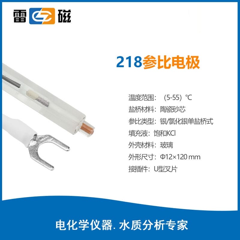 雷磁218型参比电极是一款高性能实验室用电极,采用银/氯化银单盐桥结构,配备陶瓷砂芯盐桥材料,确保参比电位稳定可靠。电极外壳为耐污染、耐腐蚀的玻璃材质,尺寸为Φ12×120mm,适用于多种实验室设备,如pH计、离子计、多参数分析仪和滴定仪。U型叉片接口设计,连接稳固便捷。采用可充式结构,配备体式加液孔塞,使用时取出加液塞,不使用时重新装回,便于维护。电极保护瓶内置适量饱和氯化钾溶液,可有效保护陶瓷砂芯,延长电极寿命。建议保存时清洁并擦干电极,补充填充液至加液口,插入含饱和KCl的保护瓶中,室温干燥保存,以备下次使用。