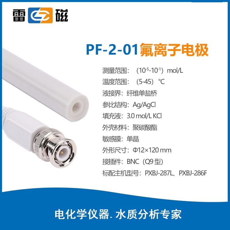 雷安磁PF-2-01氟离子电极是一款高选择性单晶敏感膜氟离子电极,测量范围为(10⁻⁶~10⁻¹) mol/L,工作温度5~45℃。采用塑壳设计,BNC(Q9型)接插件,外形尺寸Φ12×120mm。需与232-01型参比电极配合使用,适用于PXSJ-216F、PXSJ-270F等离子分析仪器。电极具有良好的稳定性与响应速度,适合在水质监测、环境检测、化工生产等领域中进行氟离子浓度测定。使用后请清洗擦干,套上保护瓶并干燥保存,以延长使用寿命。