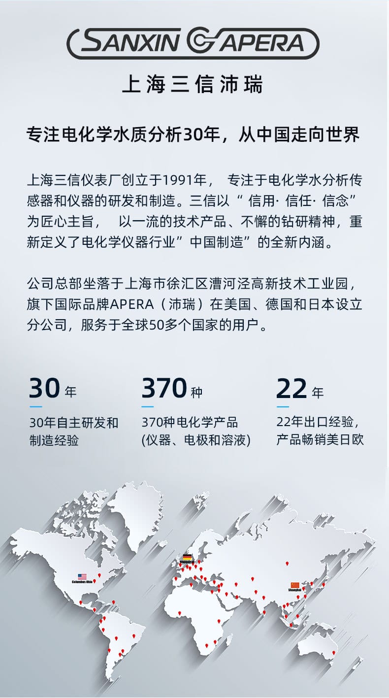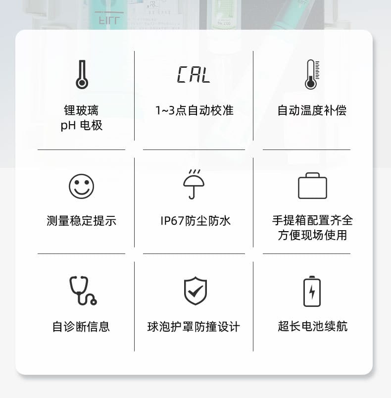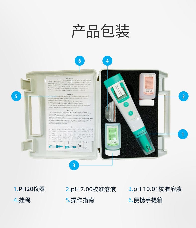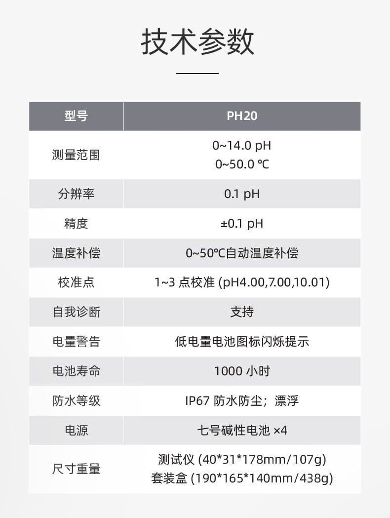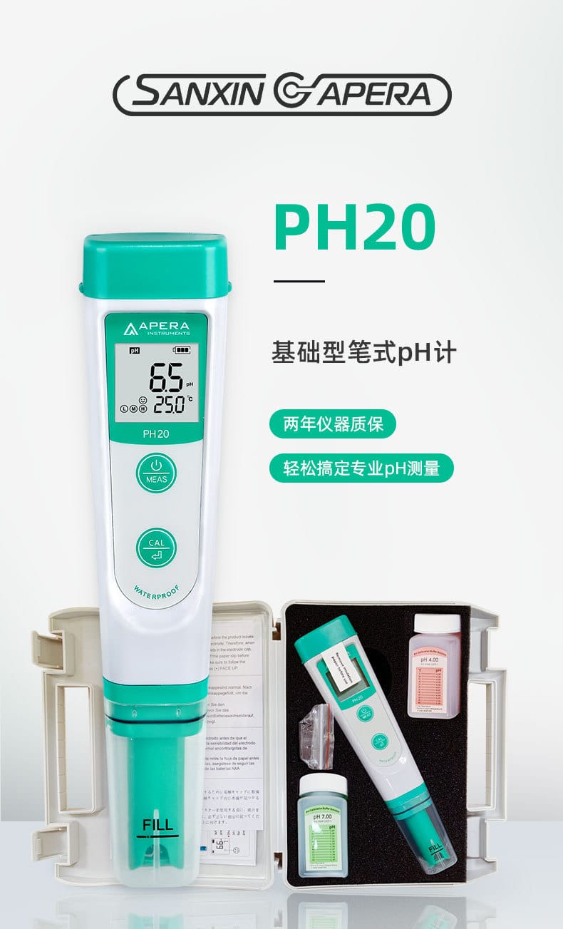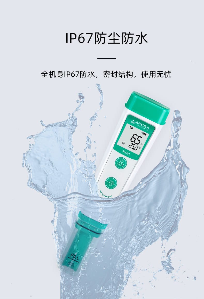 SANXIN CAPERA PH20是一款高性价比的基础型笔式pH计,专为专业水质测量设计。产品采用锂玻璃敏感膜电极,具备快速响应、测量稳定、准确度高等特点,支持0~14.0 pH范围测量,分辨率为0.1 pH,精度达±0.1 pH。设备内置自动温度补偿(0~50℃),支持1~3点校准(pH4.00/7.00/10.01),并具备自诊断功能和低电量提醒。 PH20采用IP67全机身防水防尘设计,配备可拆卸球泡护罩和全密封护套,无需浸泡即可随时使用。搭载16位TI芯片,功耗低至微安级,使用4节7号电池可连续工作1000小时,并在8分钟无操作后自动关机。 本产品广泛应用于教育科研、环境监测、饮品质量、污水处理、水产养殖、农业及生活用水等领域。套装包含主机、挂绳、pH10.01校准液、手提箱等配件,配置齐全,便于现场携带与使用。整机享受两年质保,通过CE、ISO9001:2015及RoHS认证,品质可靠。 品牌:上海三信沛瑞(SANXIN CAPERA),专注电化学水质分析30年,产品远销欧美日等50多个国家,荣获CCTV《非凡匠人》专题报道,是中国精密制造的代表品牌之一。