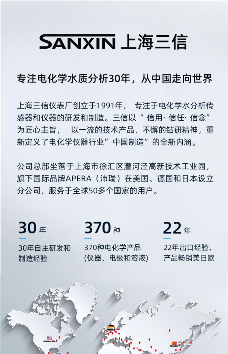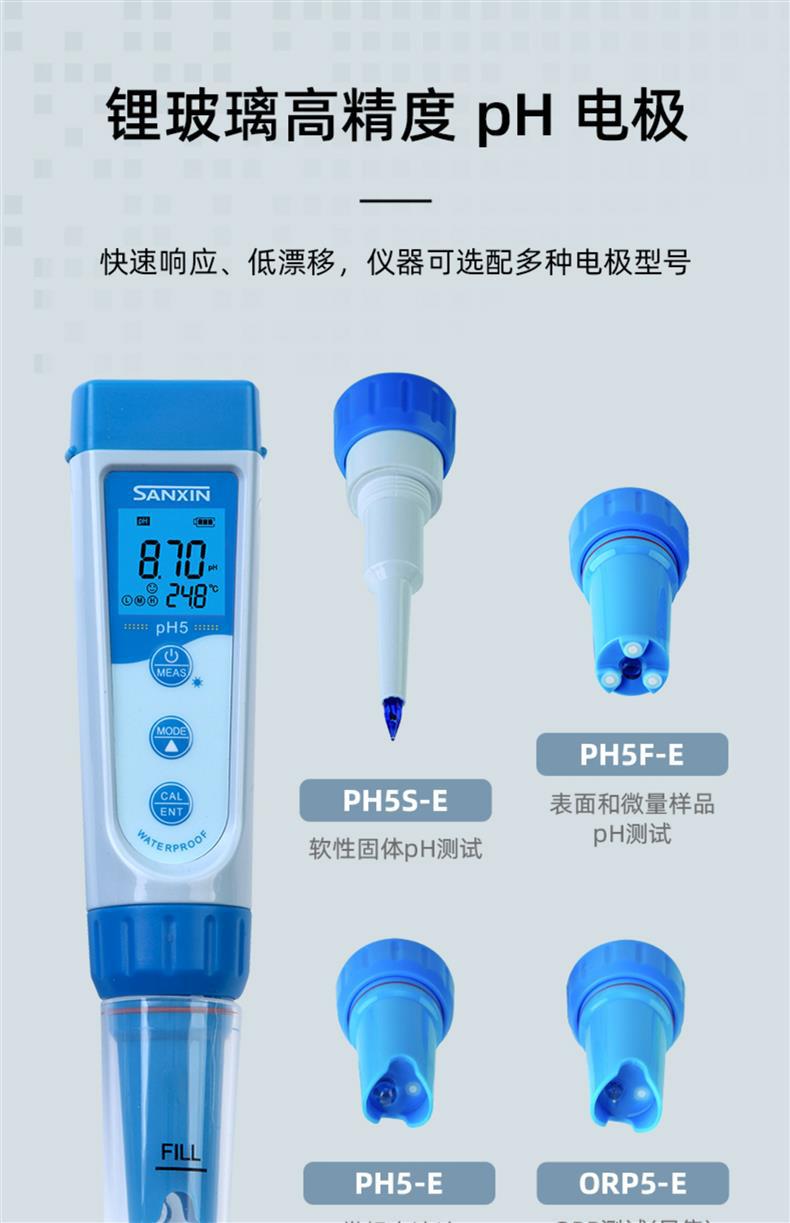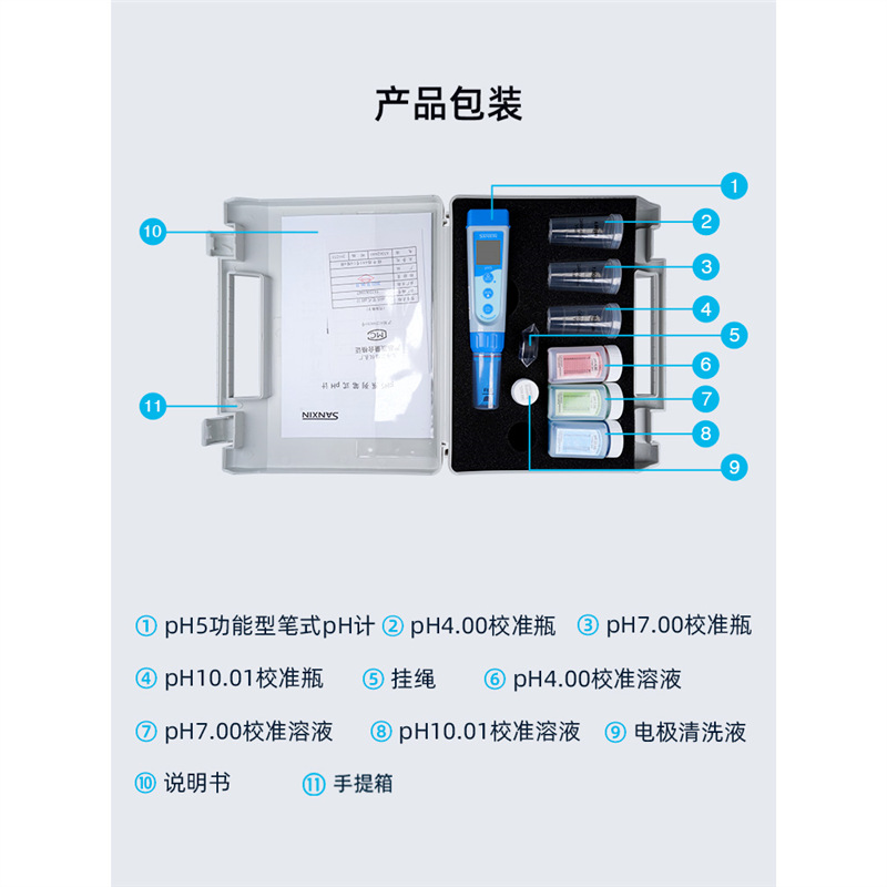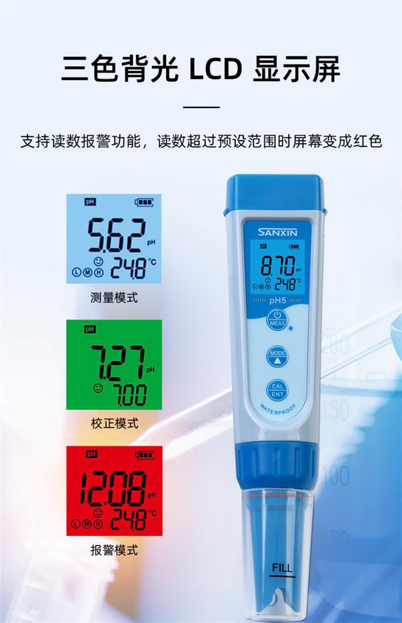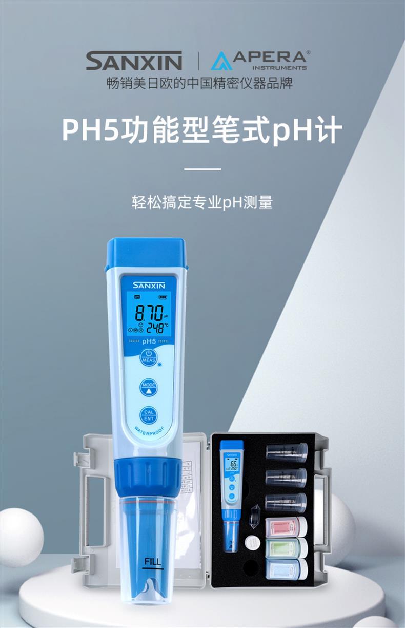 SANXIN(上海三信)pH5功能型笔式pH计是一款高精度、智能化的便携式pH测量仪器,专为现场及实验室环境设计。产品搭载锂玻璃pH电极,具备快速响应、低漂移特性,支持1~3点自动校准和自动温度补偿(0~50℃),确保测量结果准确可靠。 设备配备三色背光LCD显示屏(蓝色:测量模式;绿色:校准模式;红色:报警模式),支持读数锁定、低电压提醒及自动关机功能(8分钟无操作自动关闭)。整机达到IP67防尘防水等级,可漂浮于水面,适合复杂环境使用。 应用领域广泛,涵盖教育科研、环境监测、水处理、水产养殖、游泳池管理、饮品质量控制等。标配手提箱、校准溶液(pH4.00/7.00/10.01)、清洗液、挂绳及说明书,开箱即用。 本产品由拥有30年电化学分析经验的上海三信仪表厂制造,通过ISO 9001:2015、CE、RoHS等多项国际认证,远销美国、日本、欧洲等50多个国家。旗下品牌APERA在全球设有分支机构,品质值得信赖。 【售后服务】整机保修2年(自购买日起),支持7天无理由退换货(不影响二次销售)。本店可开具13%增值税专用发票或普通发票,请在下单时备注开票信息,未备注默认开具个人抬头普票。 【促销优惠】单件8.5折,两件8.2折,五件以上8折;订单满2000元赠送定制皮革笔记本+水性笔(价值50元)。