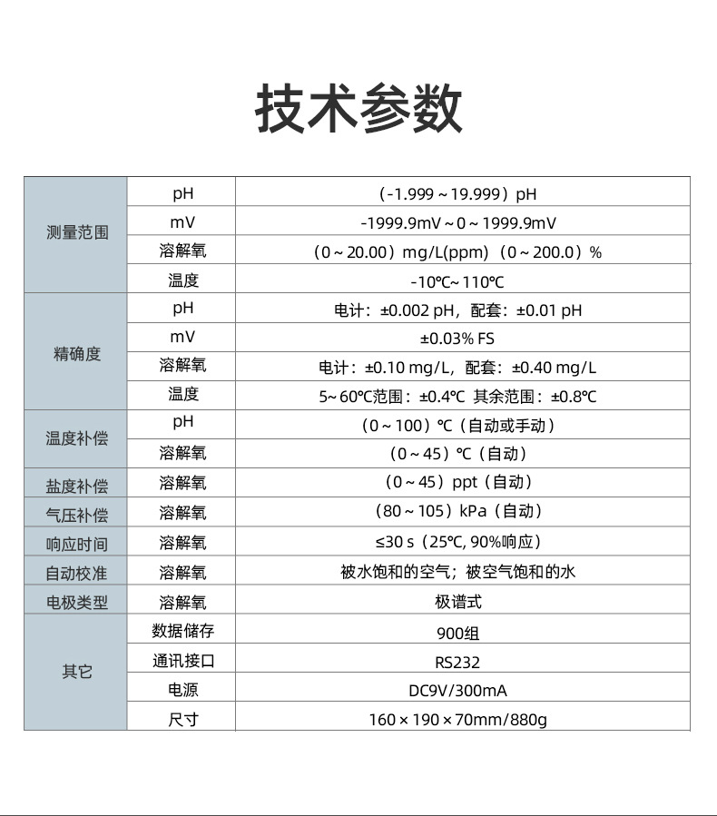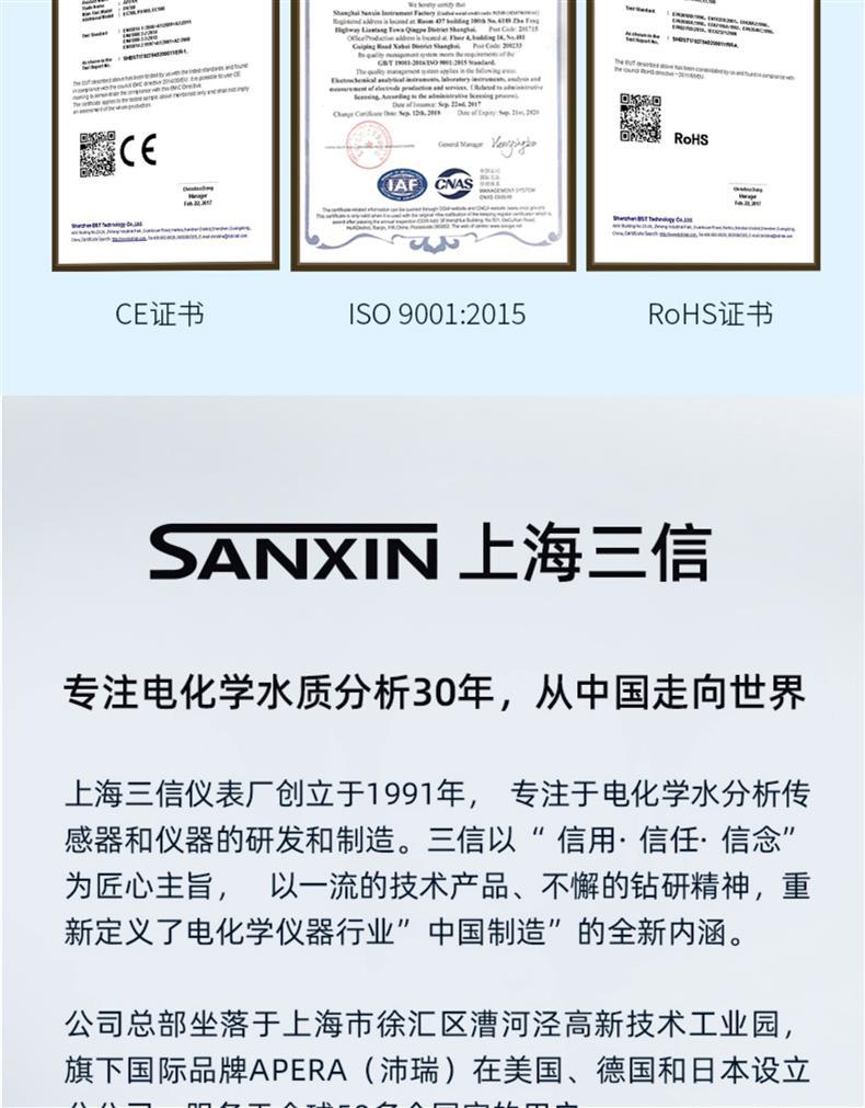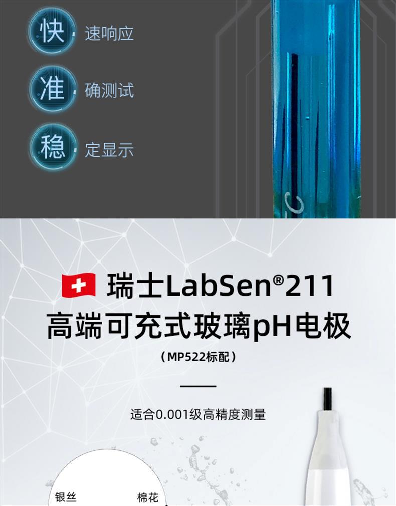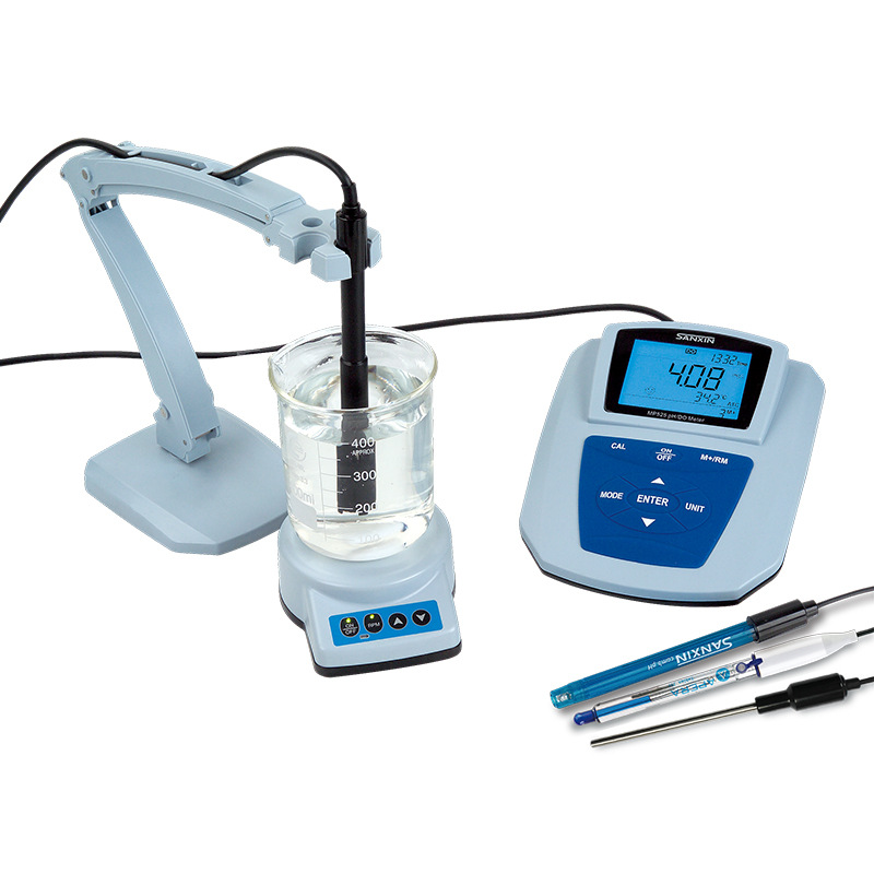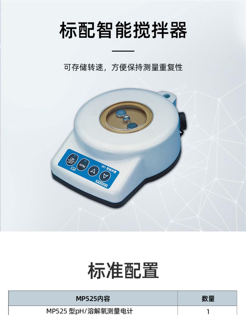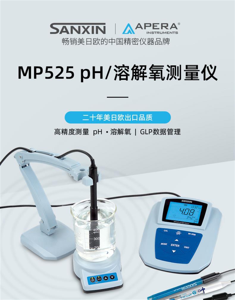 SANXIN(上海三信)MP525 pH/溶解氧测量仪是一款专业级电化学分析仪器,适用于常规水溶液的快速精确测量。该仪器具备pH、mV、溶解氧(DO)、温度等多参数测量功能,测量范围广,精度高:pH电计精度±0.002pH,溶解氧配套精度±0.40mg/L。支持自动温度、盐度和气压补偿,确保溶解氧测量更准确。 仪器配备瑞士LabSen Q211高端可充式玻璃pH电极,采用锂玻璃配方敏感膜,阻抗低、电位稳定,延长使用寿命。独特的三复合电极设计集成pH、参比与温度电极,实现自动温度补偿。溶解氧电极为专利三合一极谱型(专利号:ZL201320624287.6),内置温度与盐度传感器,极化时间仅需5分钟,大幅提升效率。 MP525支持1~3点自动校准,可识别中国、USA、NIST三大缓冲液系列,并提供纯水及加氨纯水pH测量模式,进行非线性温度补偿。具备600组GLP数据存储功能,支持手动或定时储存,并可通过RS232接口连接电脑传输数据。仪器符合IP54防尘防溅等级,配备硅胶保护帽,耐用性强。 标准配置包含智能搅拌器、多种电极、校准缓冲液及配件,满足实验室全面需求。整机享受2年保修,电极6个月保修。支持开具13%增值税专用发票,满2000元赠定制皮革笔记本+水性笔。三信专注电化学分析30年,产品出口美日欧,品质可靠,广泛应用于科研、环保、水务等领域。