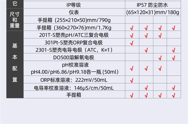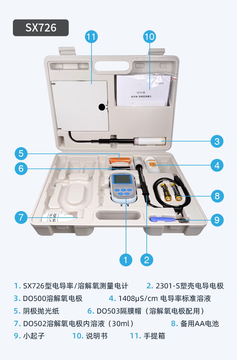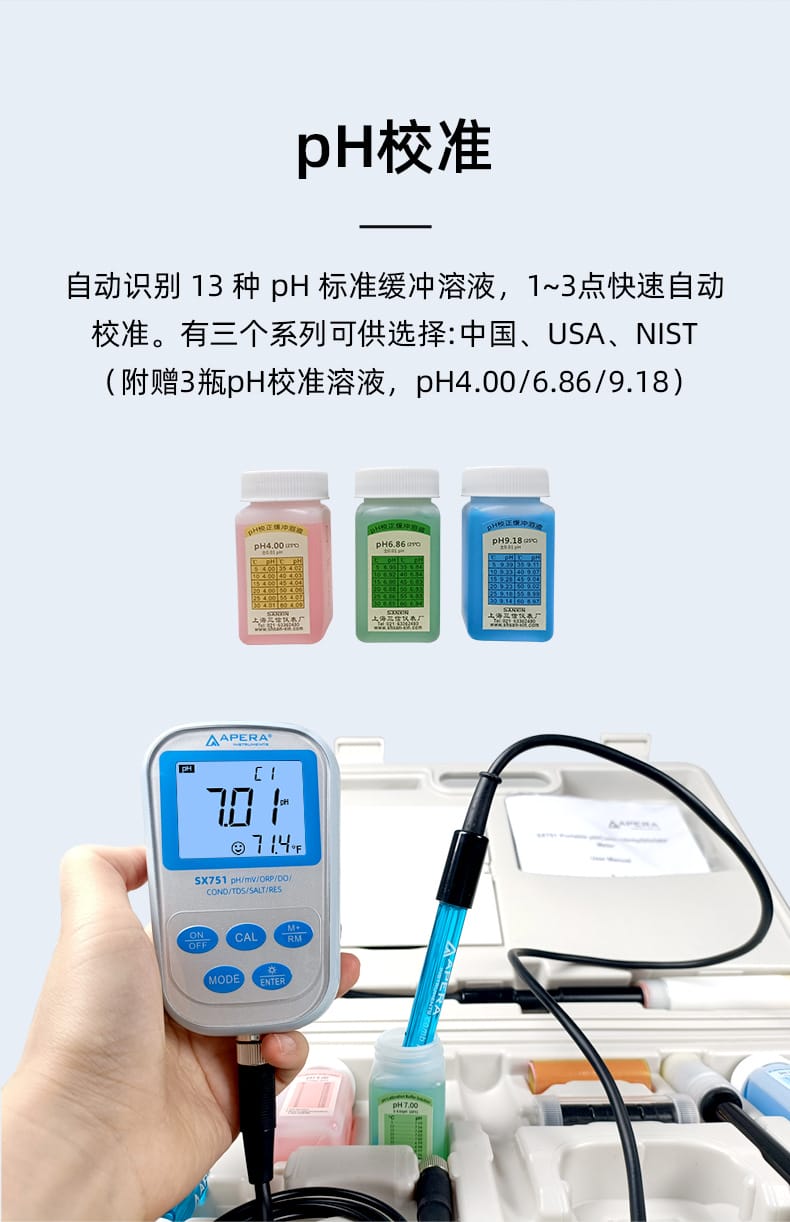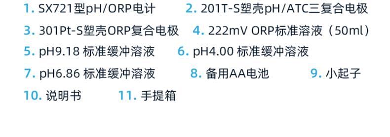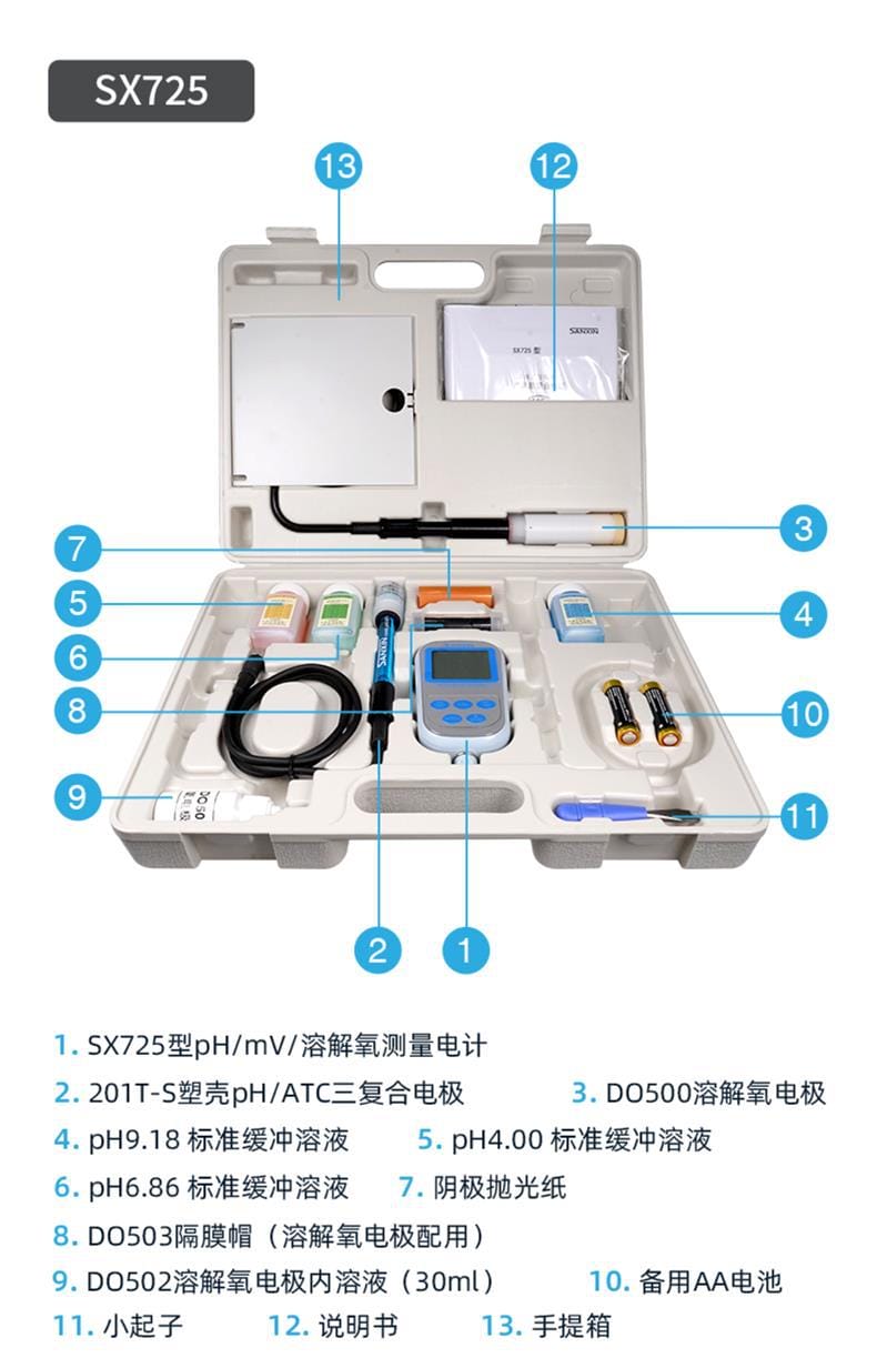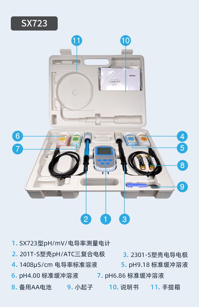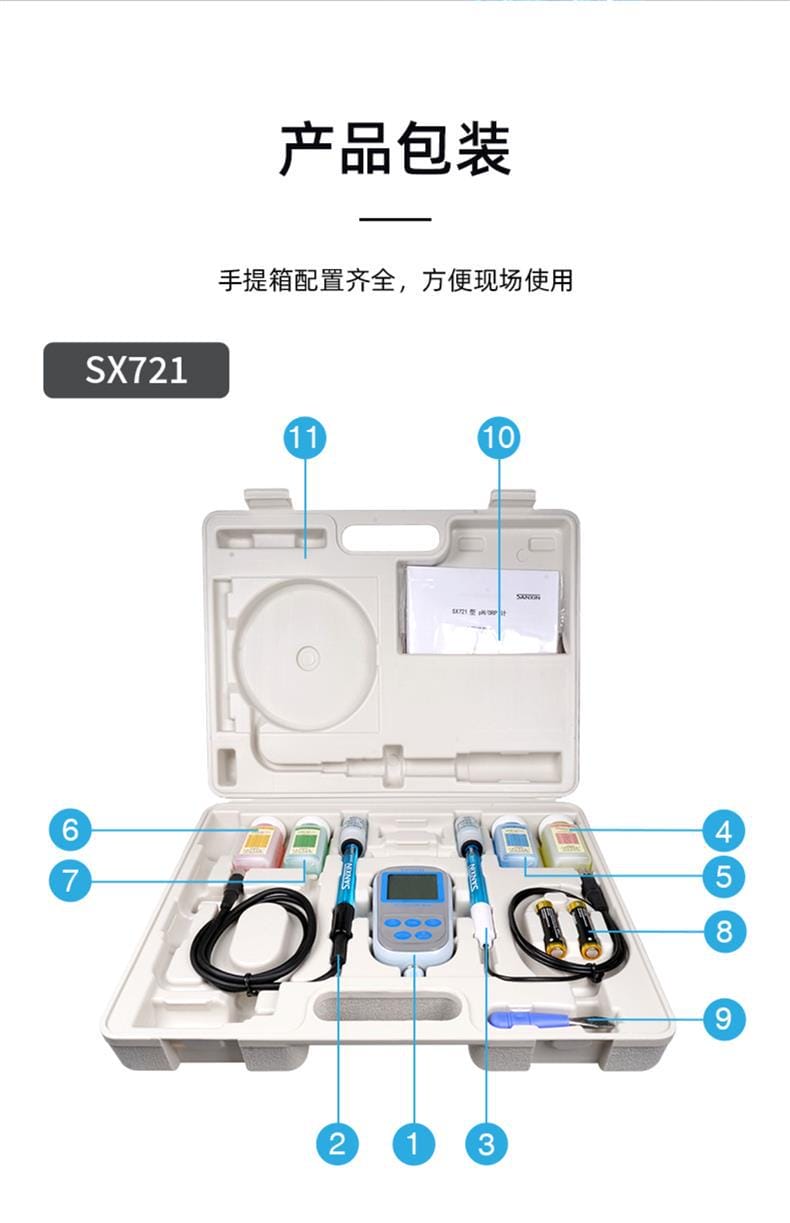 SANXIN(上海三信)SX700系列便携式双参数测量仪是一款高性能的现场水质分析设备,广泛应用于教学、科研、环境监测、水处理、食品饮料、电力及水产养殖等领域。该系列包括SX721、SX723、SX725和SX726多种型号,支持pH、ORP、电导率、TDS、盐度、电阻率、溶解氧和温度等八大关键参数测量。 产品特点: - 高精度测量:pH精度达±0.01,电导率与溶解氧测量精准稳定; - 多参数集成:一台仪器轻松实现多指标检测,提升工作效率; - 自动功能齐全:支持1~3点自动校准、自动温度补偿、自动量程切换; - IP57防尘防水:坚固耐用,适合各种复杂现场环境使用; - 背光大屏显示:清晰读数,内置自诊断系统,操作更智能; - 专用电极配置:配备201T-S三复合pH电极、2301-S坚固型铂黑电导电极、DO500溶解氧电极等高品质传感器,响应快、寿命长; - 数据存储便捷:可储存200~300组数据,便于后续分析; - 手提箱一体化设计:配件齐全,携带方便,满足野外作业需求。 特别功能: - 纯水pH模式:专为电力、石化行业设计,具备非线性温度补偿,提高纯水测量准确性; - 溶解氧自动补偿:支持温度、盐度、气压三重补偿,确保结果可靠; - 专利极谱法溶解氧电极(专利号:ZL201320624287.6):极化时间仅需5分钟,附赠备用隔膜帽和内溶液,维护简便。 品牌实力: 三信创立于1991年,专注电化学分析30年,旗下品牌APERA产品远销美国、日本、欧洲等50多个国家。通过ISO 9001:2015、CE、RoHS等多项国际认证,荣获CCTV《非凡匠人》专题报道,是中国精密仪器“智造”的代表品牌。 购买优惠:单件8.5折,两件8.2折,五件以上享8折,订单满2000元赠送定制皮革笔记本+水性笔(价值50元)。本店支持开具增值税专用发票和普通发票,请下单时备注开票信息,未备注默认开具个人抬头普票。
