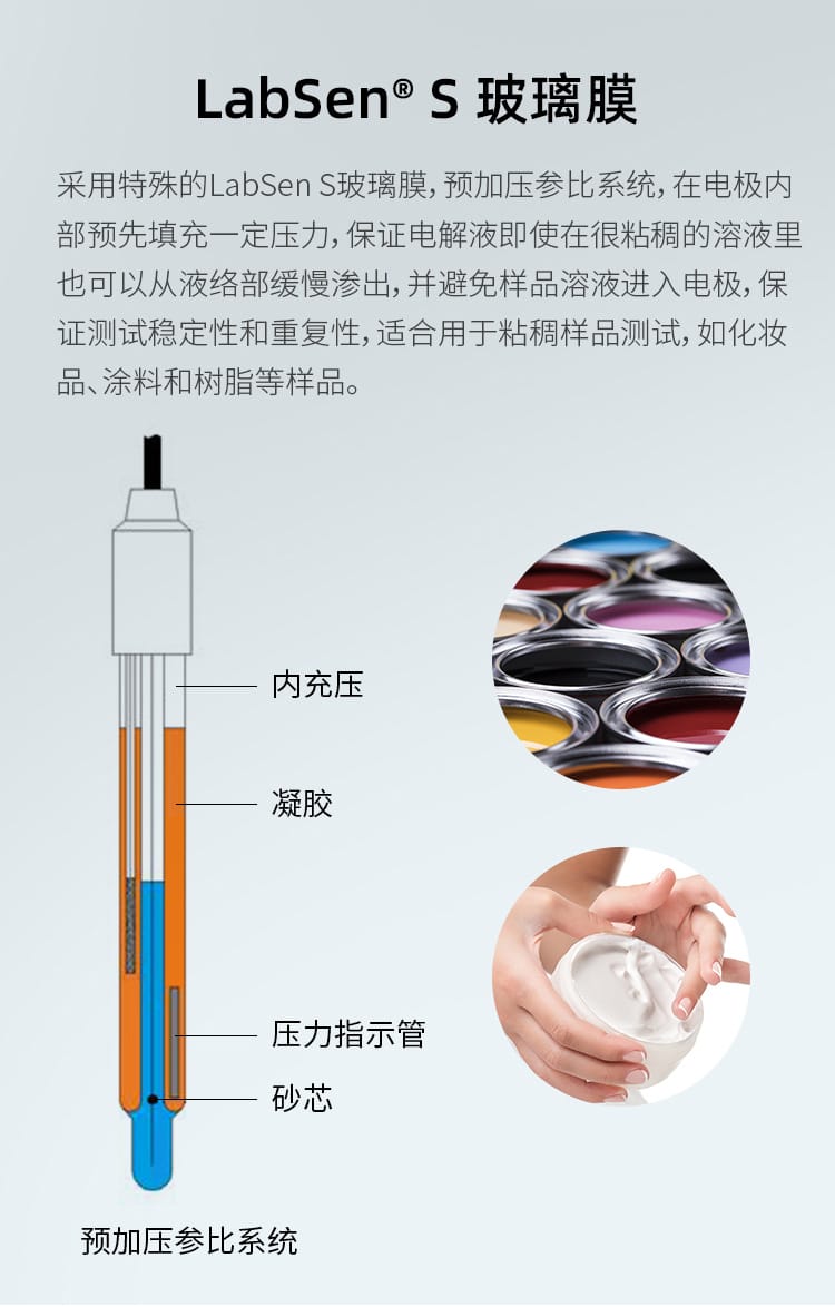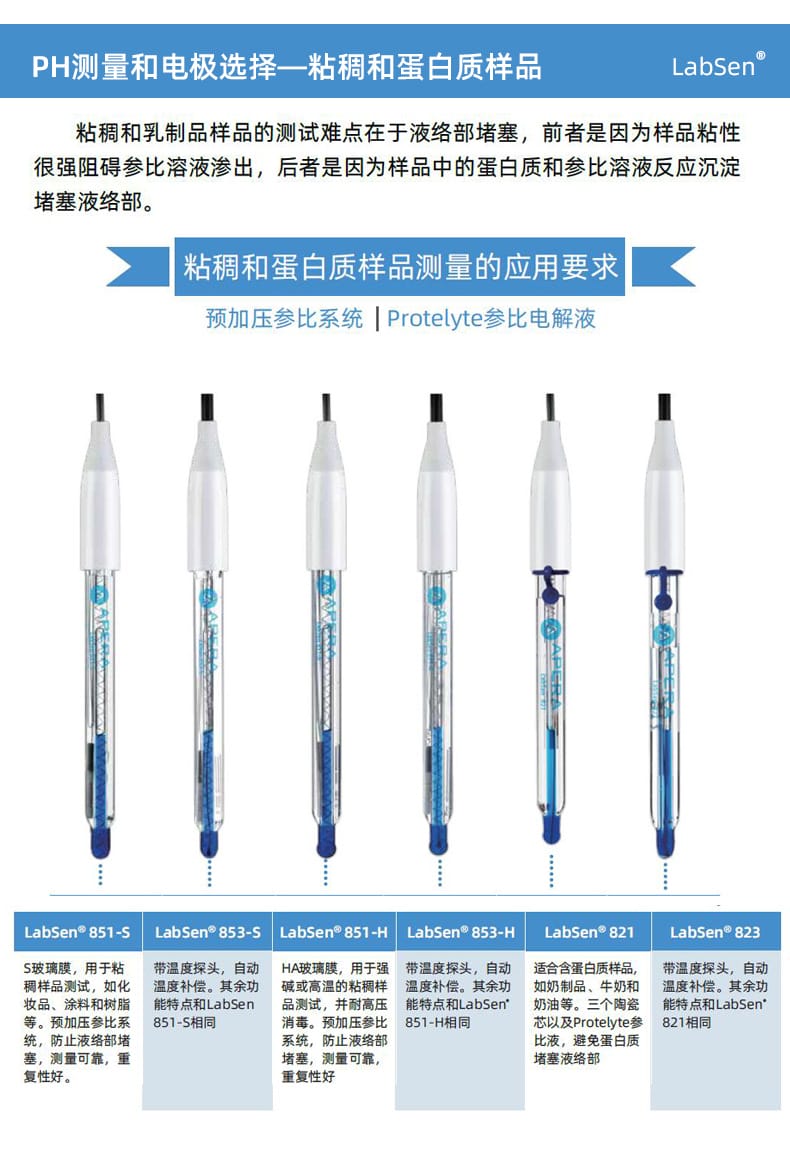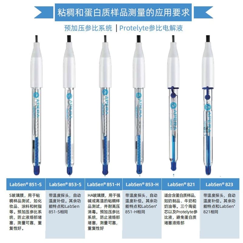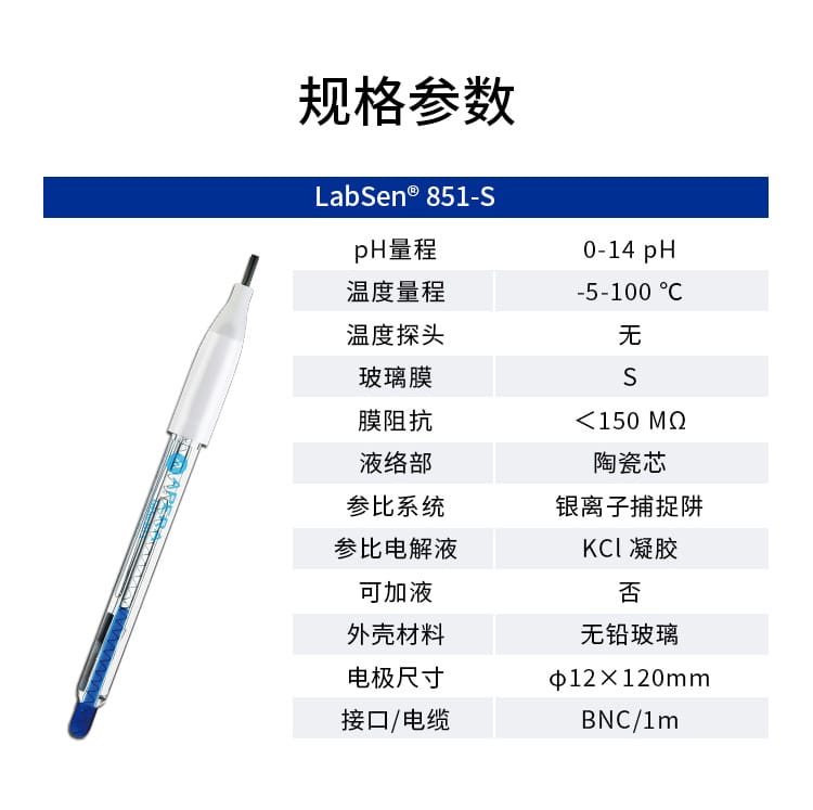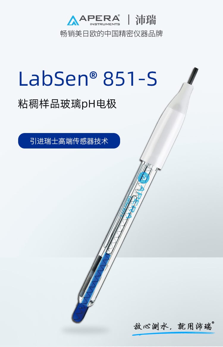 SANXIN CAPERA(上海三信沛瑞仪器科技有限公司)推出的LabSen 851-S玻璃pH电极,专为解决粘稠和含蛋白质样品的pH测量难题而设计。该电极采用先进的预加压参比系统和瑞士高端传感器技术,有效防止因样品粘性或蛋白质沉淀导致的液络部堵塞,确保测量过程稳定、响应快速、结果精确。 产品特点: - **预加压参比系统**:内部预先加压,确保KCl凝胶电解液在高粘度环境中持续稳定渗出,避免样品反向渗透,提升测试可靠性。 - **凝胶化内溶液**:蓝色凝胶工艺杜绝气泡产生,消除热对流,提高测量精度。 - **低阻抗厚膜化玻璃膜**:强度超传统球泡10倍,兼具高耐用性与快速响应能力。 - **银离子捕捉阱设计**:防止Ag⁺与硫化物或蛋白质反应,延长电极寿命。 - **适用广泛**:适用于化妆品(如面霜、染发剂)、食品(如果酱、奶制品)、化工(如涂料、树脂、胶水)等高难度样品的pH测试。 技术参数: - pH范围:0-14 - 温度范围:-5~100℃ - 接口类型:BNC / 电缆长度1m - 液络部:陶瓷芯 - 参比电解液:KCl凝胶 - 外壳材料:无铅玻璃 - 尺寸:Φ12×120mm 兼容主流BNC接口pH计,广泛适配APERA、TRUNDEAN、LEICI等品牌仪器。自购买起6个月内享受质保服务,因制造不良可免费维修或更换。 Apera品牌源自1991年上海三信仪表厂,专注电化学分析30年,产品畅销美国、日本、欧洲等50多个国家,累计销量超20万台,是值得信赖的中国精密仪器品牌。