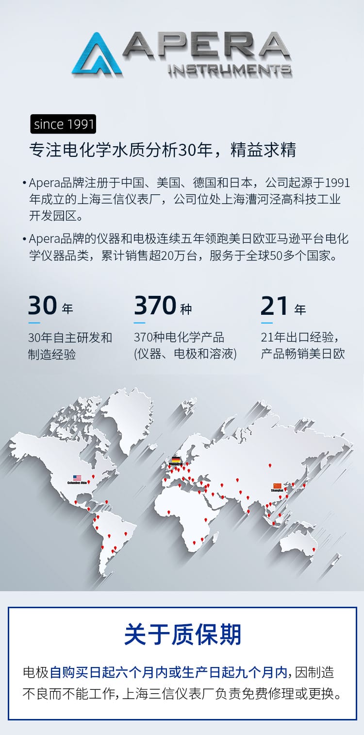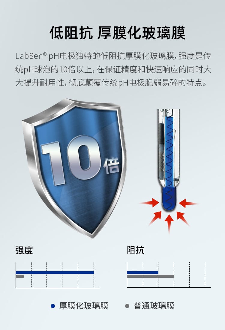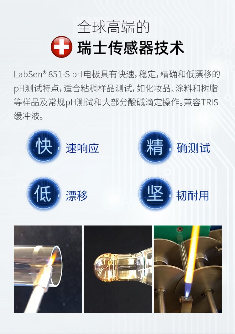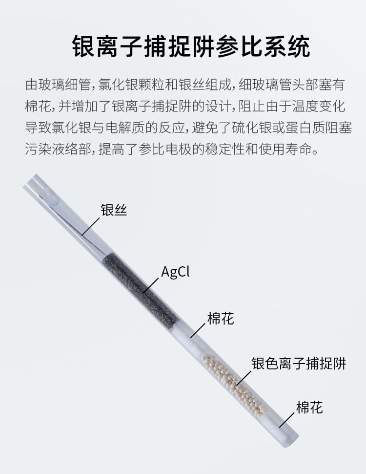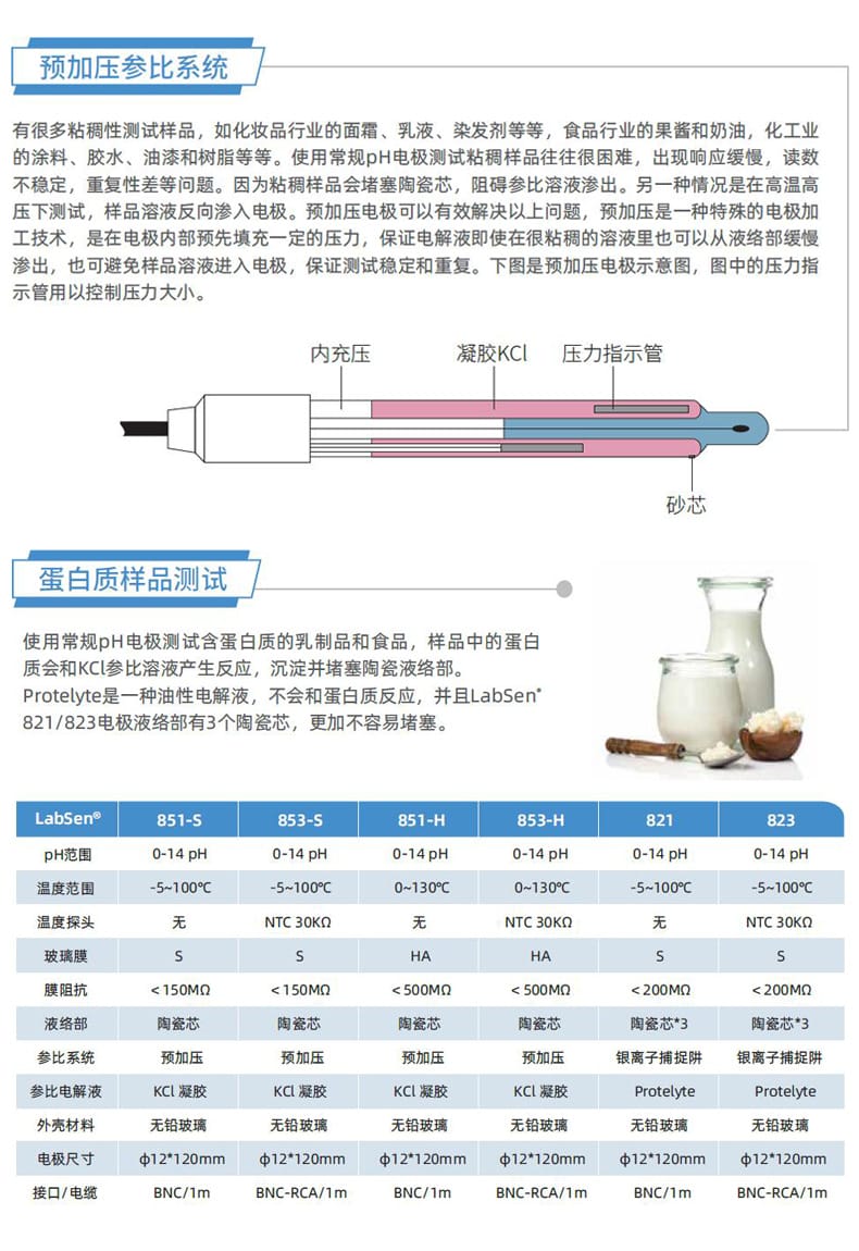 SANXIN CAPERA(上海三信沛瑞仪器科技有限公司)推出的LabSen 851-S玻璃pH电极,专为解决粘稠和含蛋白质样品的pH测量难题而设计。该电极采用先进的预加压参比系统和瑞士高端传感器技术,有效防止因样品粘性或蛋白质沉淀导致的液络部堵塞,确保测量过程稳定、响应快速、结果精确。 产品特点: - **预加压参比系统**:内部预先加压,确保KCl凝胶电解液在高粘度环境中持续稳定渗出,避免样品反向渗透,提升测试可靠性。 - **凝胶化内溶液**:蓝色凝胶工艺杜绝气泡产生,消除热对流,提高测量精度。 - **低阻抗厚膜化玻璃膜**:强度超传统球泡10倍,兼具高耐用性与快速响应能力。 - **银离子捕捉阱设计**:防止Ag⁺与硫化物或蛋白质反应,延长电极寿命。 - **适用广泛**:适用于化妆品(如面霜、染发剂)、食品(如果酱、奶制品)、化工(如涂料、树脂、胶水)等高难度样品的pH测试。 技术参数: - pH范围:0-14 - 温度范围:-5~100℃ - 接口类型:BNC / 电缆长度1m - 液络部:陶瓷芯 - 参比电解液:KCl凝胶 - 外壳材料:无铅玻璃 - 尺寸:Φ12×120mm 兼容主流BNC接口pH计,广泛适配APERA、TRUNDEAN、LEICI等品牌仪器。自购买起6个月内享受质保服务,因制造不良可免费维修或更换。 Apera品牌源自1991年上海三信仪表厂,专注电化学分析30年,产品畅销美国、日本、欧洲等50多个国家,累计销量超20万台,是值得信赖的中国精密仪器品牌。