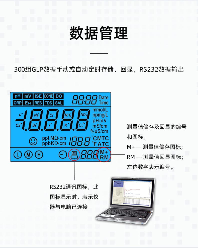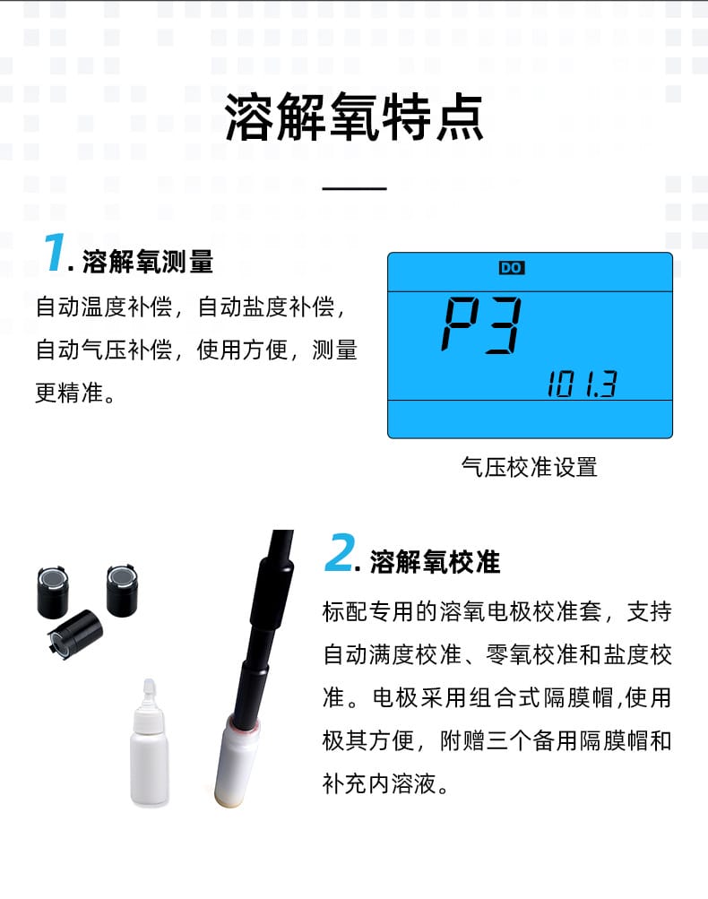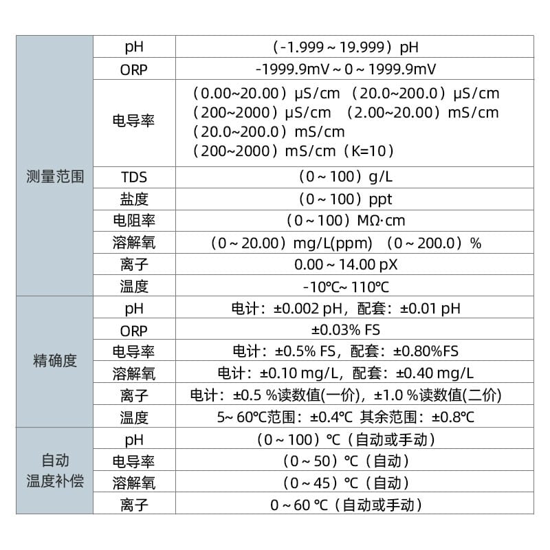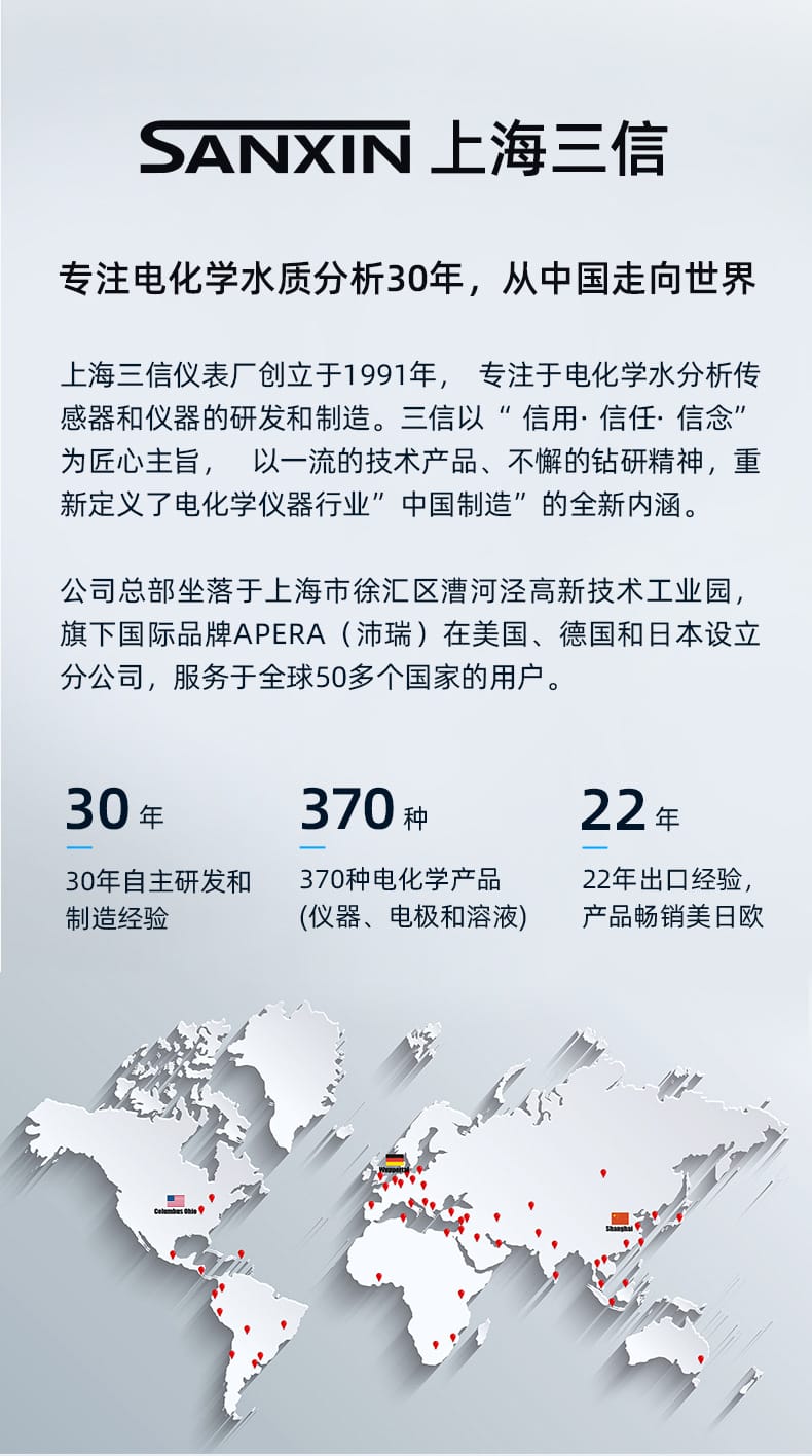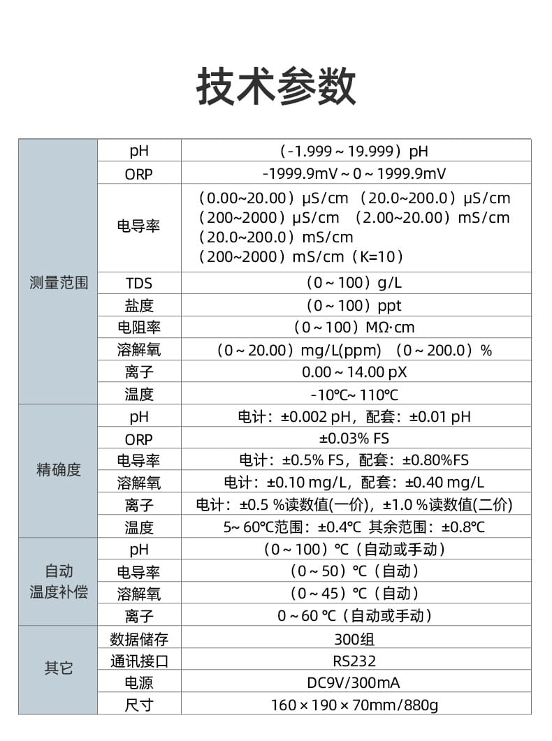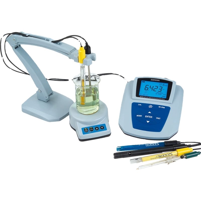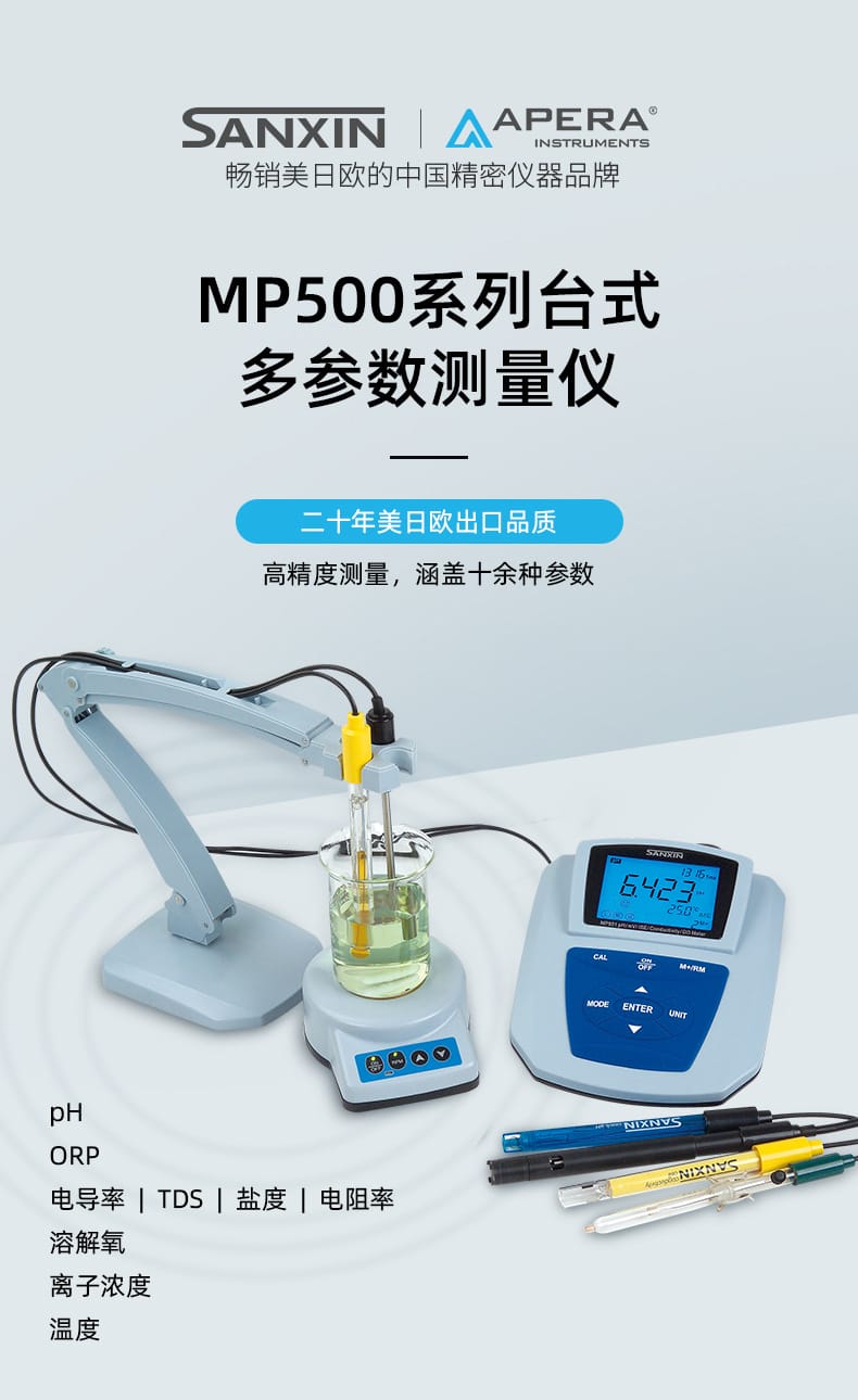 SANXIN(上海三信)MP551台式多参数测量仪是一款高性能实验室分析仪器,专为精确测量pH、ORP、电导率、TDS、盐度、电阻率、溶解氧和离子浓度等十余种参数设计。采用先进的自动变频与非线性温度补偿技术,确保在纯水、高纯水等复杂环境下仍具备卓越测量精度。 产品配备两种pH电极:201T-M塑壳三复合电极适用于常规测量;瑞士LabSen®211高端玻璃电极则满足0.001级高精度需求。溶解氧测量采用专利三合一极谱型电极(专利号:ZL2013 2 0624287.6),集成温度与盐度补偿功能,极化时间仅需5分钟,大幅提升使用效率。 仪器支持1~3点自动校准,兼容中国、USA、NIST三大缓冲液体系,并具备自诊断功能,便于故障排查。内置300组GLP数据存储,配备RS232接口实现电脑通讯,支持数据导出与远程控制。整机符合IP54防尘防溅等级,配备硅胶保护帽,适应多种实验环境。 标准配置包含智能搅拌器、多种电极、校准溶液及配件,开箱即用。广泛应用于环保、水务、制药、食品等行业。品牌提供2年仪器保修、6个月电极保修服务,支持开具13%增值税专用发票,是实验室可靠、精准、高效的测量解决方案。