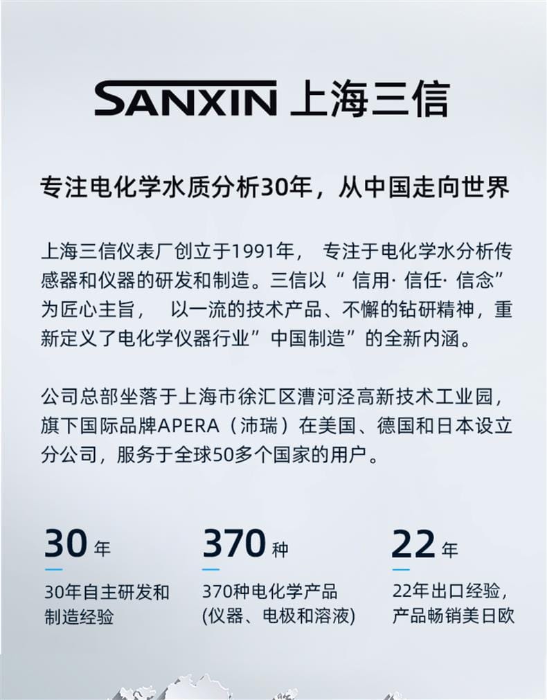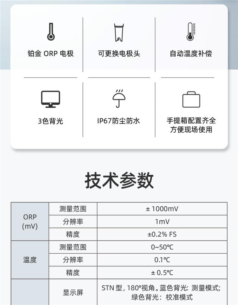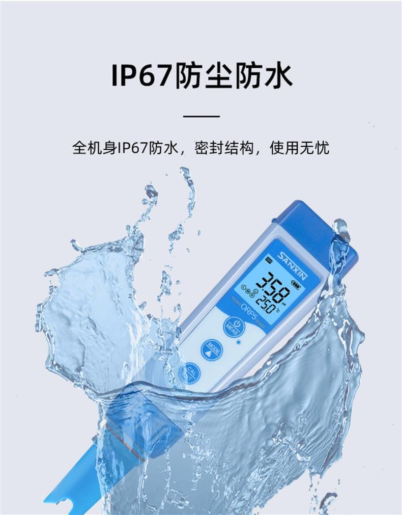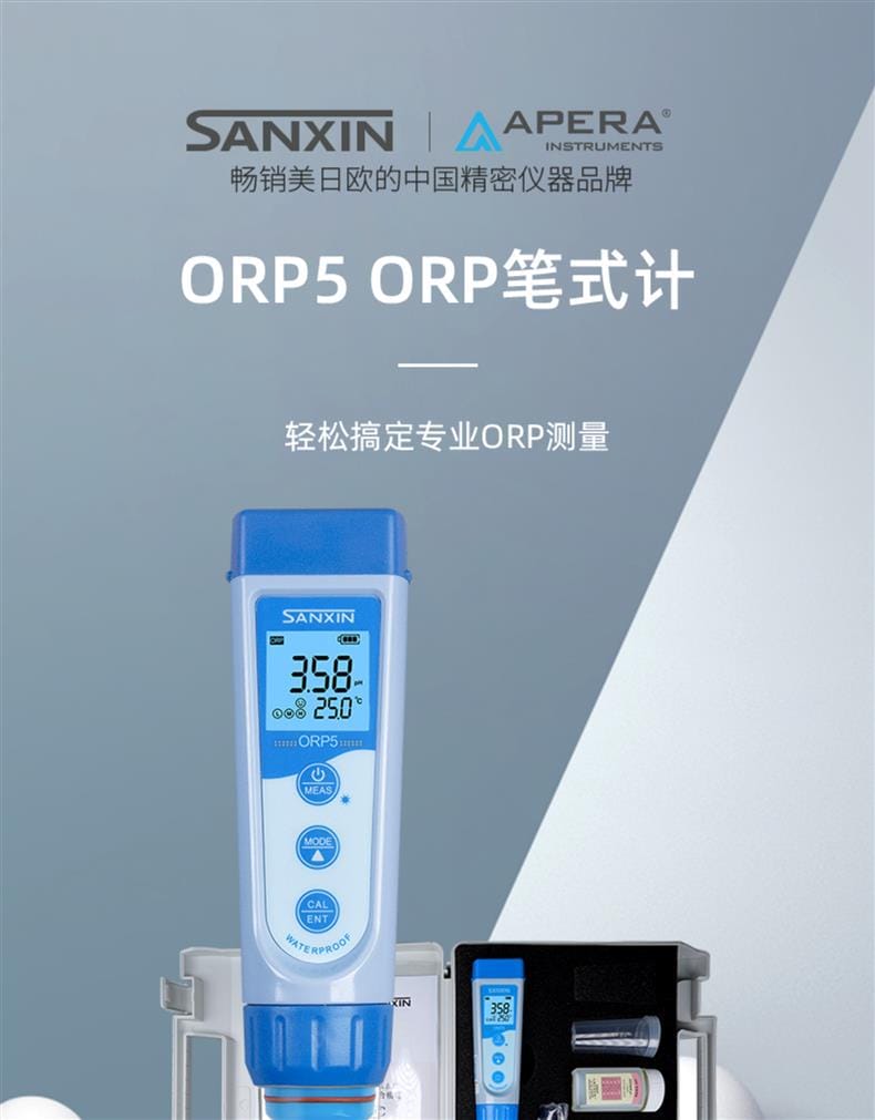 SANXIN ORP5笔式ORP计是上海三信(Sanxin)旗下品牌APERA Instruments推出的高性能便携式ORP测量仪,专为现场水质检测设计。产品采用铂金ORP电极,支持电极头更换和自动温度补偿,确保测量稳定精准。具备±1000mV测量范围,分辨率达1mV,精度±0.2%FS,搭配STN蓝绿双色背光LCD屏,直观区分测量与校准模式。 ORP5符合IP67防护等级,可漂浮于水面,适应恶劣环境使用。内置智能芯片,支持读数锁定、自动关机(8分钟无操作)、低电量提醒及报警功能(超限变红)。标配222mV校准液、电极清洗液、手提箱等全套配件,开箱即用。 广泛应用于教育科研、环境监测、水处理、游泳池管理、水产养殖、水培种植等领域。整机享受2年质保,通过ISO 9001:2015认证,CE、RoHS合规,品质可靠。关注三信公众号可享在线技术支持。本店支持开具13%增值税发票,满2000元赠定制皮革笔记本+水性笔。