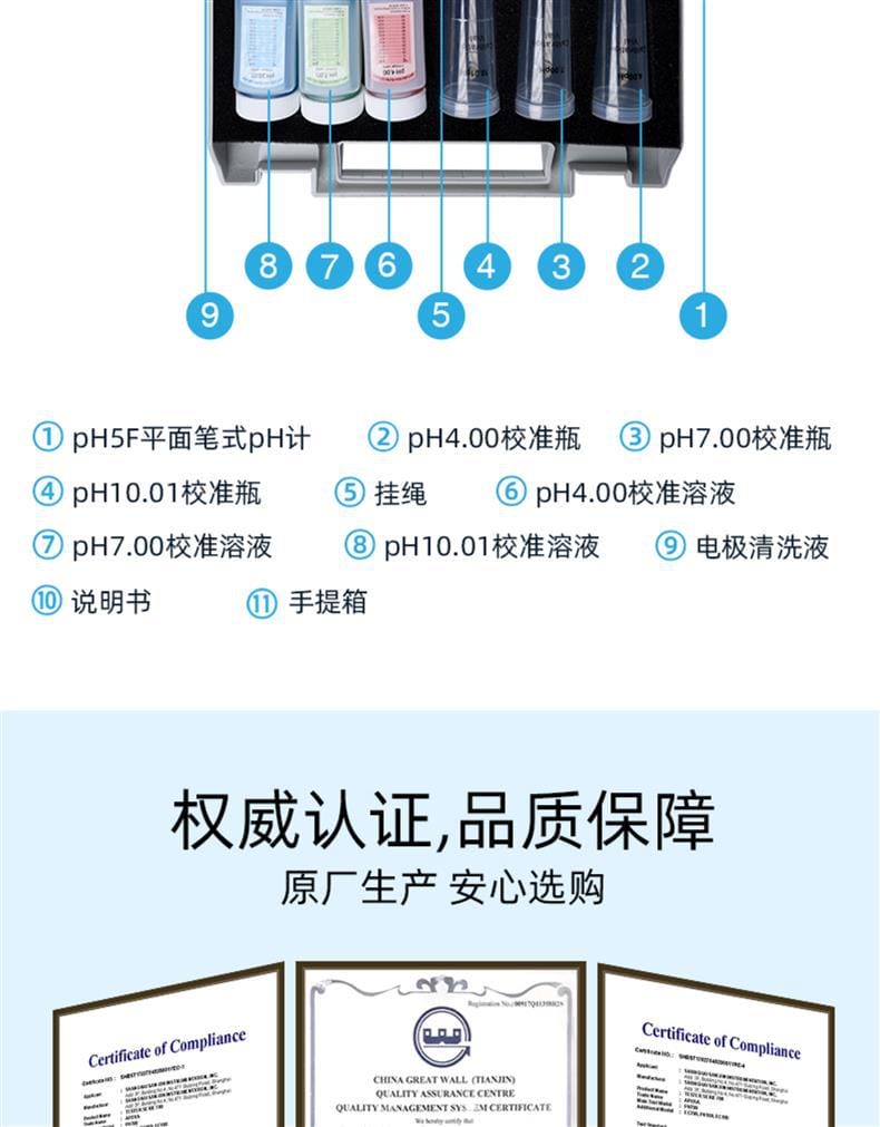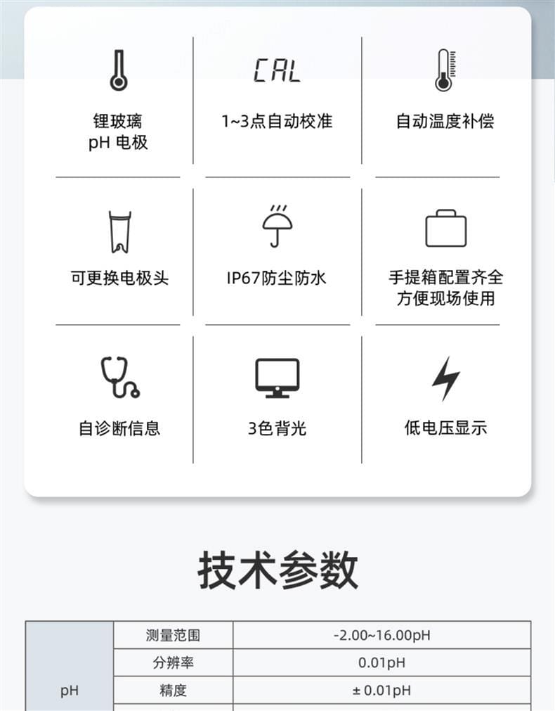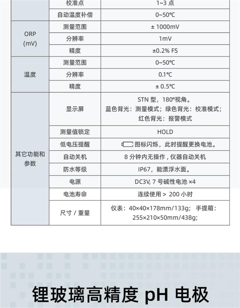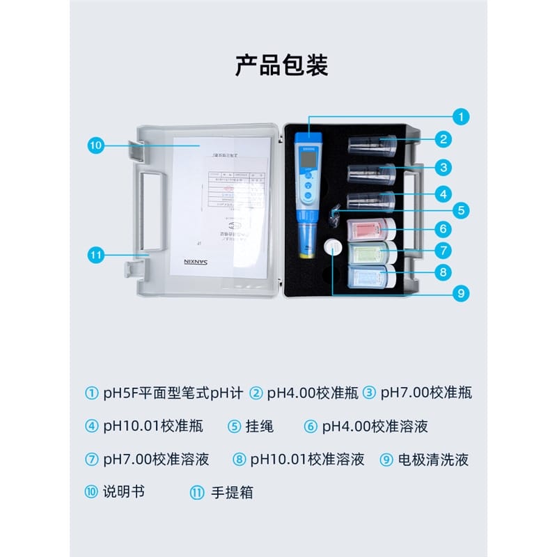 SANXIN(上海三信)pH5F平面笔式pH计是一款高精度、便携式的pH测量仪器,专为专业水质分析和现场检测设计。产品采用锂玻璃高精度pH电极,响应快速、低漂移,支持1~3点自动校准和0~50℃自动温度补偿,确保测量结果准确可靠。 设备配备STN型三色背光LCD显示屏(蓝色:测量模式;绿色:校准模式;红色:报警模式),具备读数锁定、低电压提醒(C图标闪烁)、自动关机(8分钟无操作)等功能,电源为4节7号碱性电池,连续使用超200小时,适合长时间户外作业。整机达到IP67防水等级,可漂浮于水面,适应恶劣环境。 应用领域广泛,包括常规水溶液、皮肤、纸张、布料、皮革、微量样品及软性固体的pH测试。标配手提箱、校准液(pH4.00/7.00/10.01)、清洗液、挂绳及说明书,配置齐全,开箱即用。 品牌保障:三信专注电化学分析30年,通过ISO 9001:2015、CE、RoHS认证,产品远销美日欧50多个国家。旗下国际品牌APERA(沛瑞)在美国、德国、日本设有分公司,品质值得信赖。全国联保2年,支持开具13%增值税专用发票,满2000元赠定制礼品,多件购买享阶梯折扣,是实验室与工业现场的理想选择。