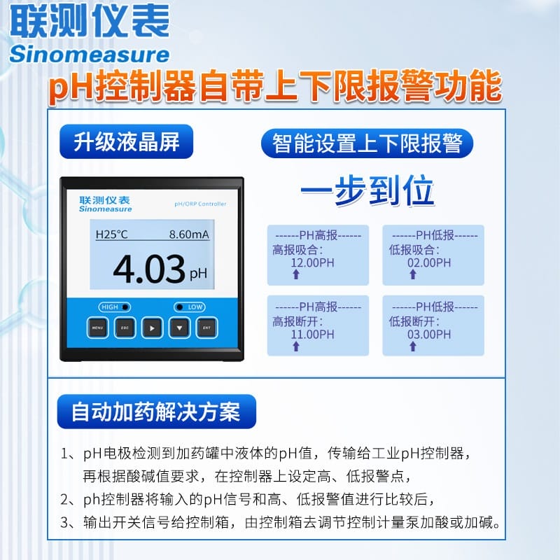 联测仪表(Sinomeasure)专注于酸碱加药行业的全自动解决方案,其核心产品pH控制器在加药装置中起关键作用。通过pH电极实时监测液体酸碱度,并将信号传输至工业pH控制器,用户可在设备上设定高低报警点,控制器比较信号后输出开关指令,联动控制箱调节计量泵自动加酸或加碱,确保系统稳定运行。 该系列pH控制器已累计销售超过10万台,广泛应用于东莞珀蓝特、江苏绿港、兴立环保、湖北聚盛等企业,实现精准、智能的pH调控。产品具备多种型号可选,支持pH/ORP测量、NTC10K/Pt1000温度补偿、RS485通信、多路报警输出等功能,防护等级高达IP65,适应复杂工业环境。 联测仪表拥有18年行业经验,通过CE、SGS、ISO9001等多项国际认证,持有国家发明专利及实用新型专利,配备300000套年产能的现代化生产基地,服务网点覆盖全国,提供售前售后24小时技术支持,是值得信赖的自动化传感设备品牌。