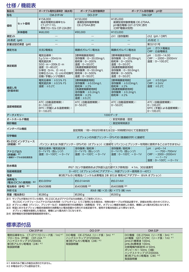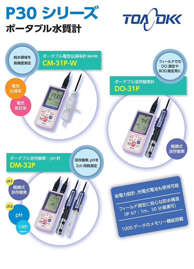 任氏(JENCO)P30系列水质分析仪是一款专为高精度水质检测设计的便携式仪器,广泛应用于纯水处理、环境监测和实验室分析。该系列产品包括CM-31P-W纯水电导率仪、DO-31P溶解氧测定仪以及DM-32P双通道溶氧/pH复合测定仪。 CM-31P-W采用交流两极法,测量范围涵盖5μS/m~20mS/m电导率和高达200kΩ·m的电阻率,适用于超纯水系统监控。DO-31P与DM-32P配备隔膜式溶解氧电极(OE-270AA),支持标准与高浓度模式切换,测量范围可达0~50.0mg/L,满足多种应用场景需求。 DM-32P可同时测量溶解氧(ch1)和pH/ORP(ch2),pH测量精度达±0.02pH,并通过JIS形式I认证,型号SS101获得计量法型式批准。所有机型均内置ATC自动温度补偿功能,支持手动MTC模式,确保测量准确性。 设备具备IP67级防水设计(1米深度30分钟浸没防护),适合现场使用;配备大容量充电电池或干电池供电,功耗低至约0.014W,电池寿命最长可达600小时(CM-31P-W)。支持定时记录、外部打印机连接(EPS-P30)、RS-232C数据传输及模拟电压输出,便于数据管理与集成。 标配包含专用电极、标准缓冲液、内部填充液及操作手册,开箱即用。适用于水处理、制药、电子等行业对水质进行可靠、高效的现场或多参数同步检测。