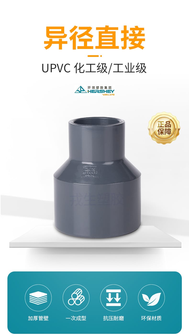 环琪(HERSHEY)UPVC异径直通管件,采用工业级加厚设计与优质UPVC颗粒一次成型,内壁光滑,流通性能优异。产品具备出色的耐酸碱、耐腐蚀性能和良好的不透光性,适用于高要求的工业环境。广泛应用于半导体、电子工业、集成电路、液晶显示器、医药制剂、化妆品、电镀工艺及精细化工等领域。规格齐全,支持DN20至DN100多种异径连接,确保系统密封性与稳定性,是化工及高端制造行业理想的管道连接解决方案。