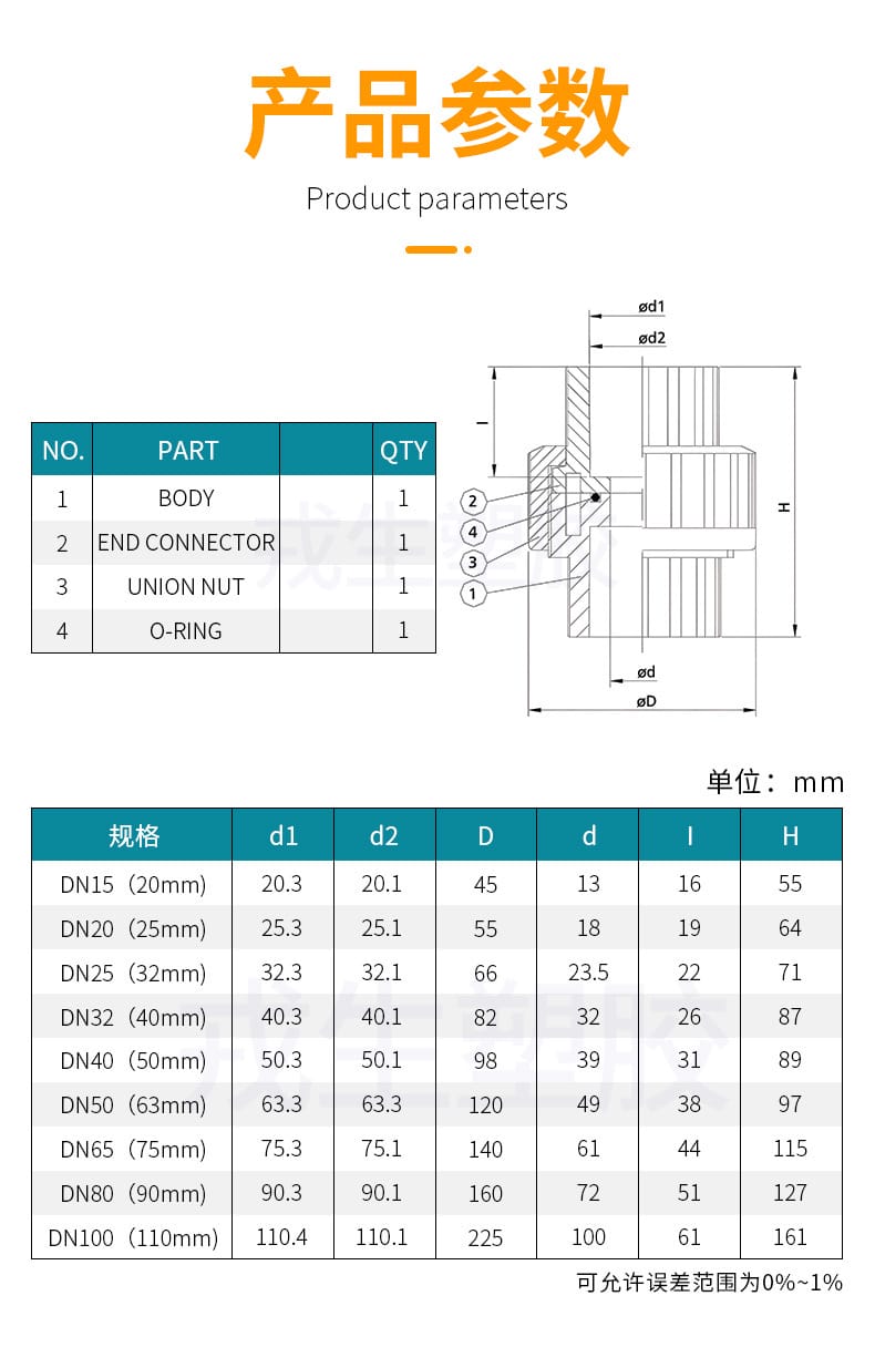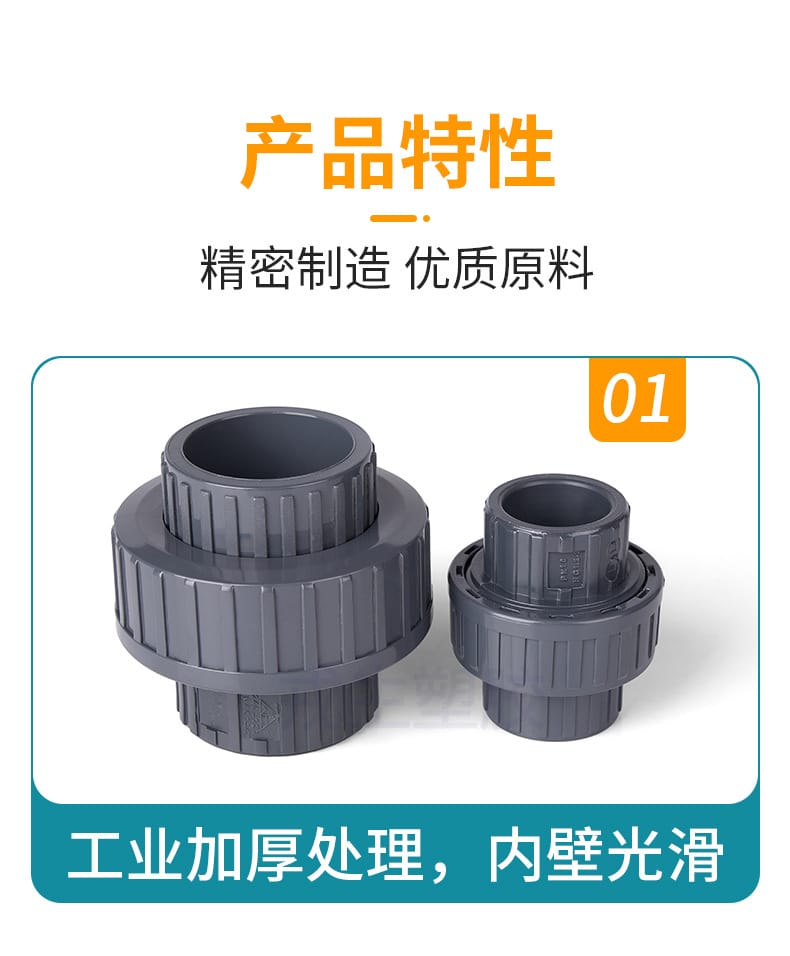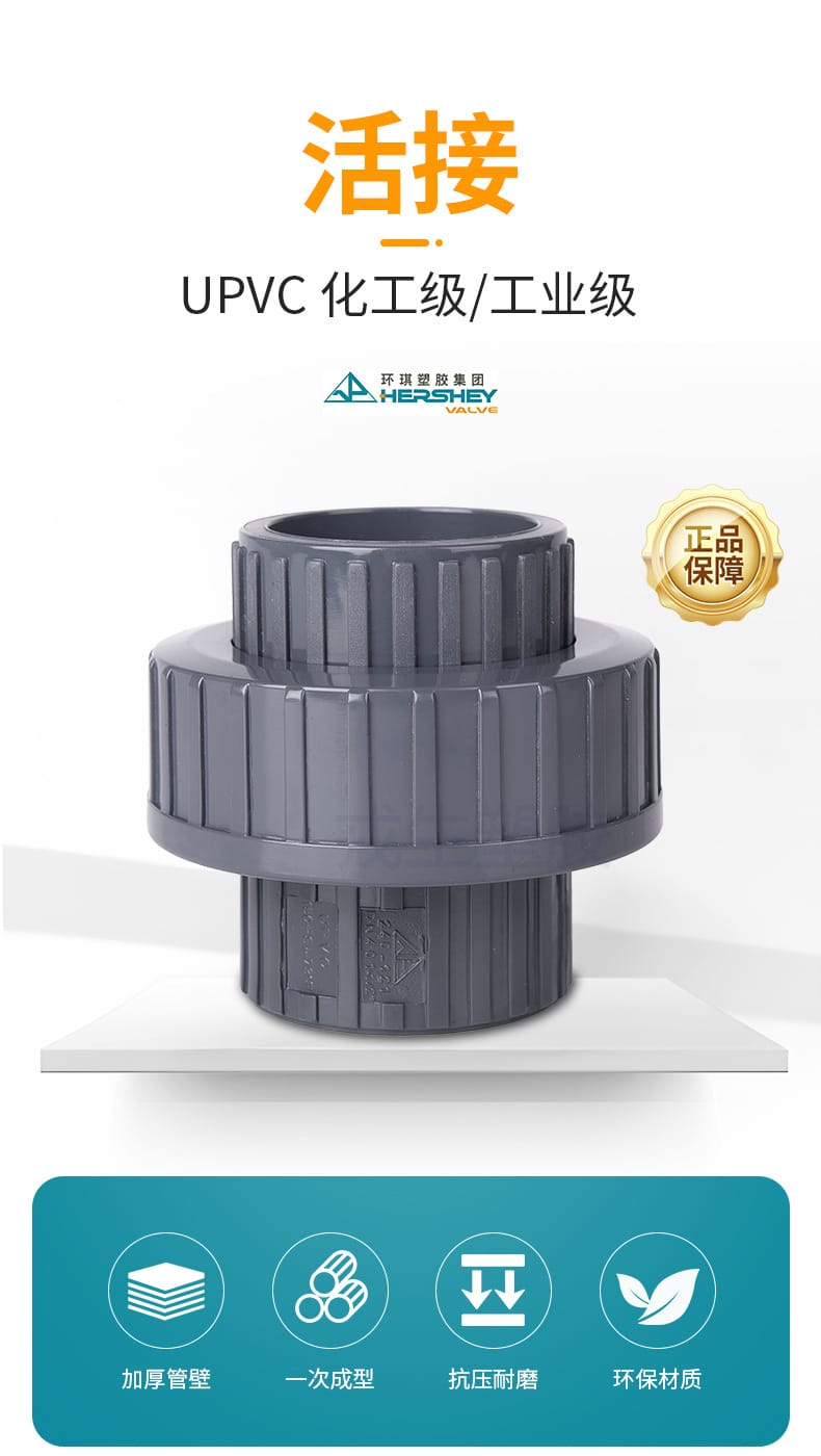 阔思(KUOSI)工业级UPVC活接头,采用优质UPVC颗粒一体成型,内壁光滑,具备优异的抗压、耐磨及耐酸碱腐蚀性能。产品广泛应用于半导体、电子工业、药品生产、化工合成、电镀工艺等高端制造领域。规格涵盖DN15至DN100,尺寸精度高,允许误差范围0%~1%,确保稳定密封与长久耐用。加厚管壁设计,提升承压能力,满足严苛工况需求。正品保障,源自环琪塑胶集团Hershey Valve,品质值得信赖。