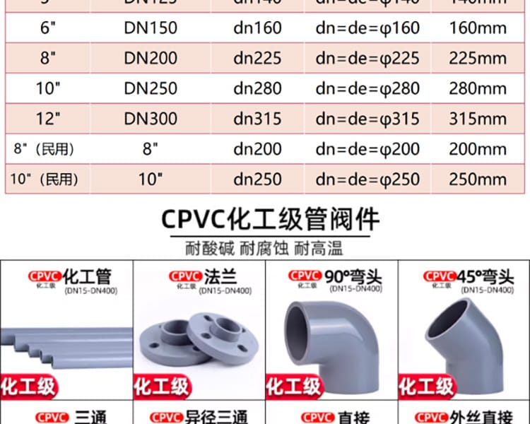 安徽台塑华亚塑胶科技有限公司是专业生产CPVC化工级管材及管件的实力源头厂商,拥有多年行业经验,专注高品质塑料管道系统的研发与制造。公司严格按照国家标准生产,产品通过ISO质量管理体系认证及中国合格评定国家认可委员会(CNAS)实验室认可,确保每一件产品都经过层层检验,品质可靠。 主要产品包括: - CPVC化工级90°弯头、45°弯头(DN15-DN400) - CPVC三通、异径三通、直接、内外丝直接 - CPVC活接、大小头、补芯、管帽、马鞍座 - CPVC双由令球阀、法兰球阀 - 工业级活套法兰与一体法兰(DN15-DN200),符合国标尺寸,耐高压、防裂抗压 所有产品采用全新料生产,具备优异的耐酸碱、耐腐蚀、耐高温(可达110℃)性能,内壁光滑,流通顺畅,适用于化工、电镀、环保水处理等多种工业介质输送场景。 我们提供一站式采购服务,现货充足,支持代发代送,24小时内快速发货。欢迎海内外客户来电咨询,携手合作,共创共赢!
