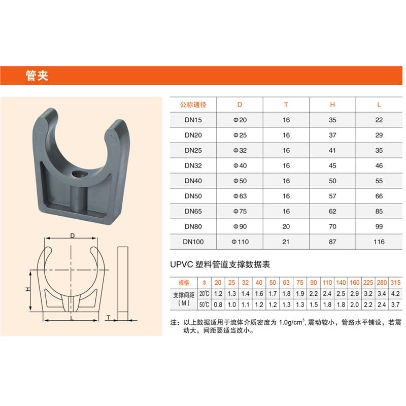 Lige(力高)UPVC管夹是专为流体系统设计的高性能管道支撑固定件,采用高纯度UPVC(聚氯乙烯)材料制造,具有优异的耐腐蚀性、柔韧性和结构强度。产品加厚设计,耐压可达1.0MPa,适用于各类水处理、化工及工业管道系统。 提供多种规格选择,涵盖DN15至DN315,常见规格包括DN32、DN40、DN50等,满足不同管径需求。配套支撑间距数据表指导安装,确保管道系统稳定可靠。适用于水平铺设、震动较小的环境,若环境震动较大,建议缩短支撑间距以增强稳定性。 我们承诺所有产品均为全新优质原料生产,发货前严格检验,确保货物完整准确。订单确认后一天内发货(每日16:00发运),15:30前付款可优先安排。支持申通、圆通、顺丰、德邦等快递及物流配送。购买满1000元可开具13%增值税专用发票。 选择Lige力高管夹,为您的管道系统提供安全、耐用、高效的支撑解决方案。