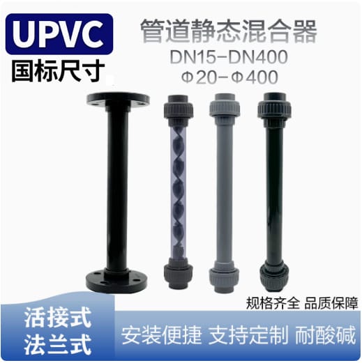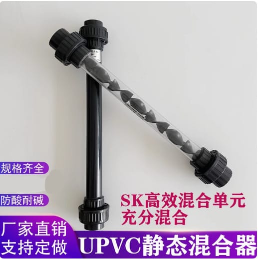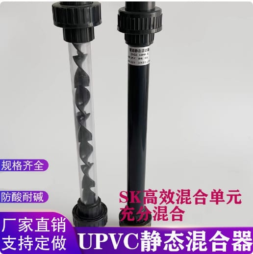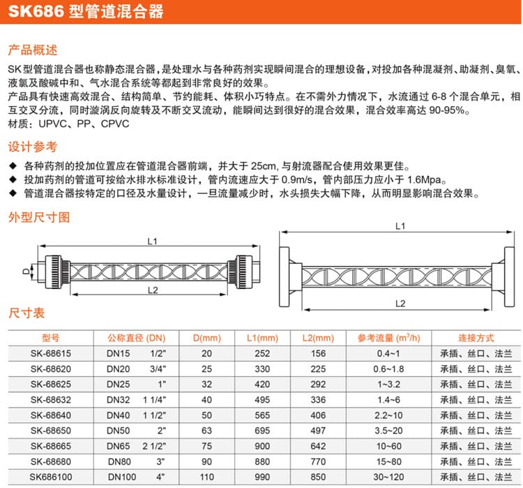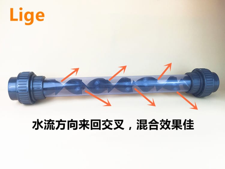 Lige SK686型管道静态混合器(又称静态混合器)是水与各类药剂瞬间混合的理想设备,广泛应用于水处理、石油化工、制药、食品生产等领域。该混合器采用UPVC、PP、CPVC等耐腐蚀材质制造,具备防酸耐碱、结构紧凑、无需外力驱动、节能高效等特点。
