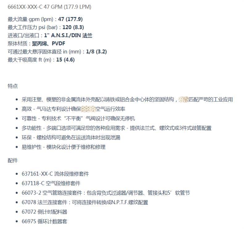 英格索兰(Ingersoll Rand)ARO高品质气动隔膜泵,专为严苛工业环境设计,具备高性价比、节能环保、运行可靠等优势。产品采用注塑模塑非金属流体外壳(聚丙烯或PVDF材质)与铸铁/铝合金中心体结合,结构坚固,耐腐蚀性强。 最大流量达47 GPM(177.9 LPM),最大工作压力120 psi(8.3 bar),进液口/出液口支持1" ANSI/DIN法兰连接,可通过最大悬浮固体直径为1/8英寸(3.2 mm),最大干吸高度15英尺(4.6米),噪音低至64.5 dB(A)(70 PSI,60 cycles/min),适合多种复杂工况。 核心特点包括: - 专利高效气马达设计,提升空气利用效率; - “不平衡”气阀技术,确保持续运行不卡顿; - 模块化结构,维修便捷,维护成本低; - 螺栓式密封结构,杜绝流体泄漏,环保安全; - 多种端口配置可选(法兰式、螺纹式、三件式歧管),适配性强。 可选膜片材质丰富,包括氟橡胶、丁腈橡胶、三元乙丙橡胶、杜邦聚酯弹性体、医疗级山道橡胶及PTFE/山道橡胶复合膜,满足不同介质输送需求。 标配配件齐全,支持空气段与流体段独立维修,配备维修套件、空气管路连接组件、法兰转接套件等,便于现场快速维护。 原厂品质保证,一年质保,货源充足,支持加工定制,广泛应用于化工、环保、水处理、制药等行业。立即选购,享受无忧售后与快速发货服务。