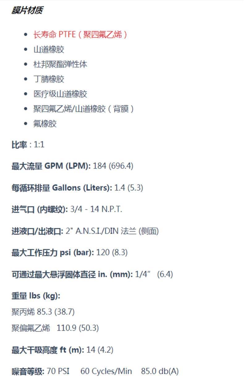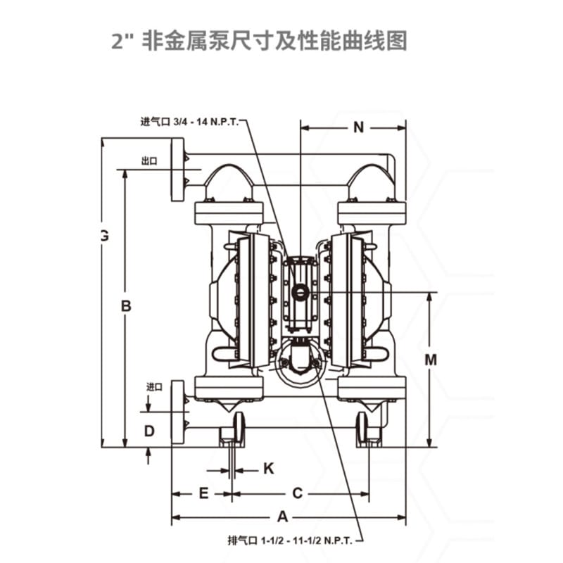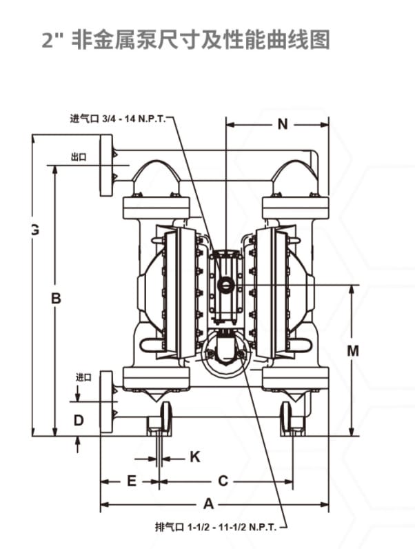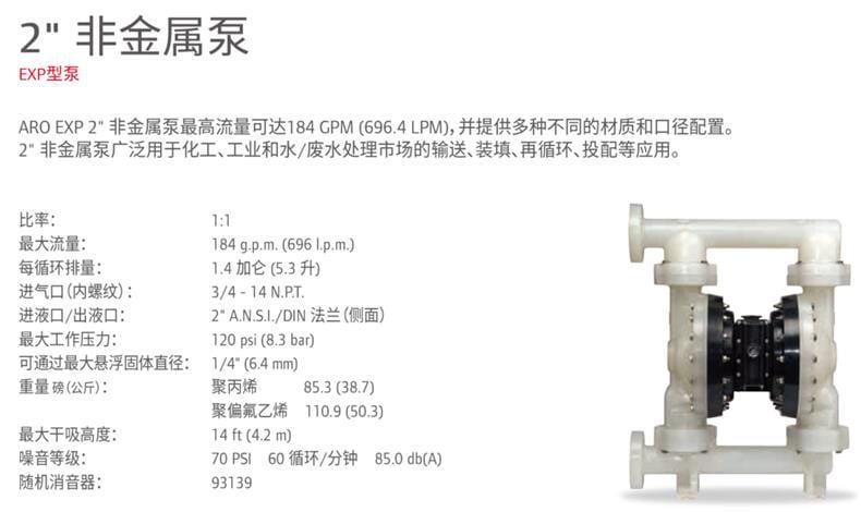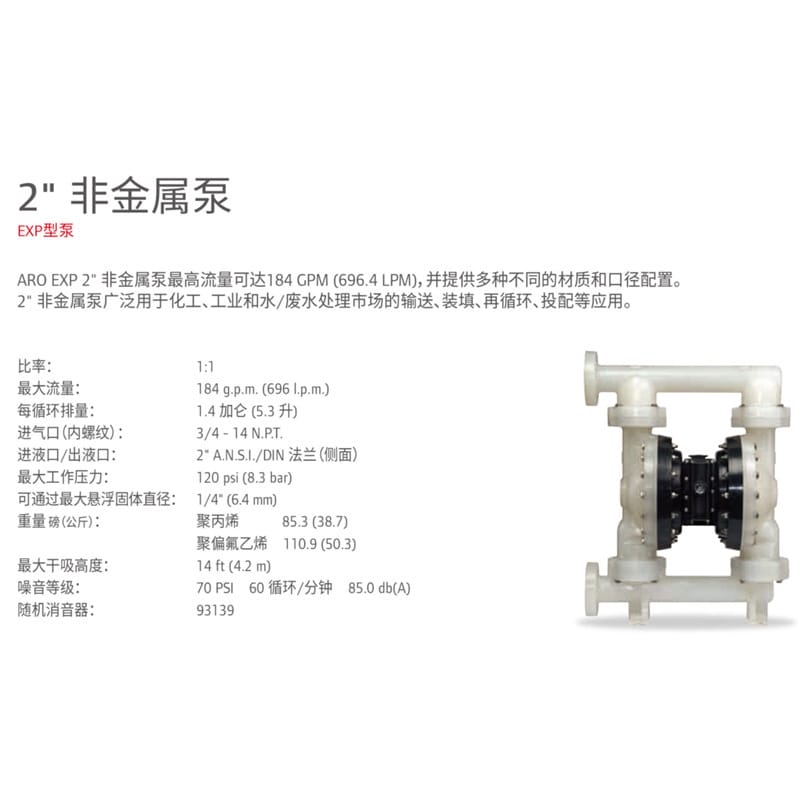 英格索兰(Ingersoll Rand)ARO EXP 2"非金属隔膜泵是一款高性能气动隔膜泵,最大流量可达184 GPM(696.4 LPM),广泛应用于化工、工业及水/废水处理领域的输送、装填、再循环和投配等场景。该泵采用聚丙烯或聚偏氟乙烯(PVDF)泵体材质,具备优异的耐腐蚀性能,并可选配导电型材料以适应不同工况需求。 产品特点包括: - 高效Simul-Shift气阀系统,确保精准换向; - 独特“不平衡”气阀设计,运行可靠,无卡滞停机风险; - 模块化歧管配置(中心、末端、双进出口),灵活适配多种应用; - 螺栓式结构结合一体式流体盖,防止泄漏与破裂,更环保安全; - 可配备长寿命PTFE膜片,提升耐用性。 技术参数: - 比率:1:1 - 最大工作压力:120 psi (8.3 bar) - 进/出液口:2" ANSI/DIN法兰(侧进侧出) - 进气口:3/4" NPT内螺纹 - 最大可通过悬浮固体直径:1/4" (6.4mm) - 最大干吸高度:14 ft (4.2 m) - 噪音等级:85.0 dB(A) @ 70 PSI, 60 cycles/min - 可选膜片材质:PTFE、山道橡胶、丁腈橡胶、氟橡胶、杜邦聚酯弹性体、医疗级橡胶等 支持电磁阀与反馈系统定制(如行程末端检测、泄漏监测等),满足ATEX/IECEx/NEC等防爆标准,是高要求工业环境的理想选择。厂家直销,质保一年,发货迅速,服务完善。