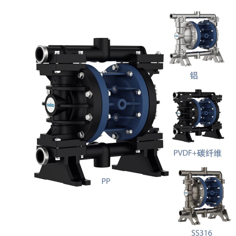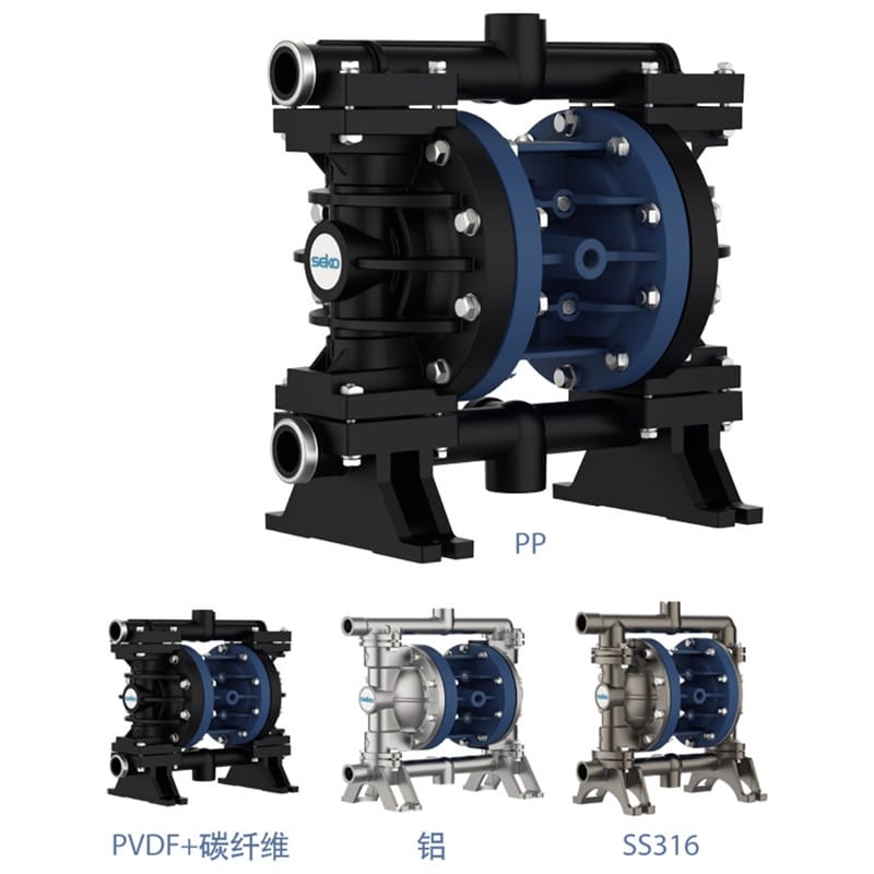 SEKO JANUS系列气动双隔膜泵是一款高性能、多功能的流体输送设备,广泛应用于汽车、制药、化工、食品、水处理、电镀、采矿等多个行业。该系列泵提供多种泵头材质(包括聚丙烯PP、PVDF+碳纤维、铝合金、不锈钢316和聚甲醛),满足不同介质的化学兼容性需求,流量范围从7升/分钟至880升/分钟,连接尺寸覆盖¼"到3",适用于各种工况环境。