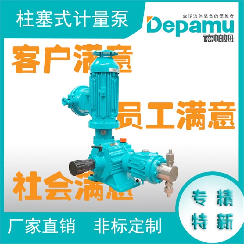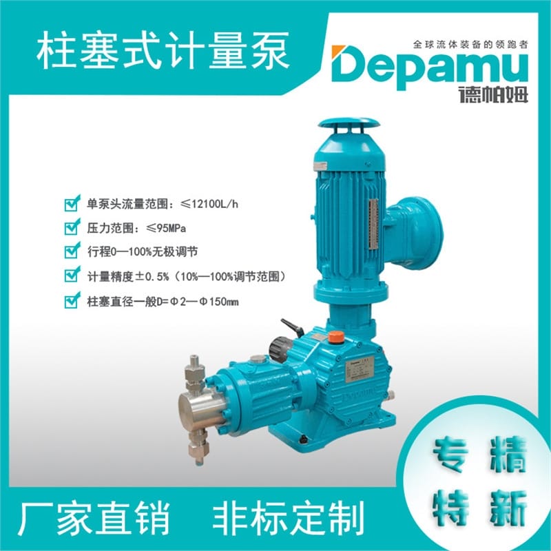 德帕姆(DEPAMU)柱塞式计量泵采用高性能柱塞与进口密封组件,确保长久使用寿命和卓越密封性能。通过柱塞往复运动实现工作腔容积周期性变化,完成介质的精确吸入与排出。产品具备油浸式润滑系统,保障传动机构长期稳定运行;配备高精度单向阀组,提升计量精度与流通效率。支持手动、电动、气动及变频多种调节方式,行程可在0-100%无级调节,计量精度达±0.5%(在10%-100%调节范围内)。单泵头流量最高可达12100L/h,最大压力可达95MPa,过流部件可选304、316、316L、904、哈氏C等耐腐蚀材料,满足不同工况需求。一体式‘欧德’蜗轮副传动结构,运行低噪高效,维护简便。可实现多头并联运行,最多支持12头组合,有效降低脉冲或实现多介质比例输送。适用于化工、石化、天然气、电力、冶金等行业中高粘度、高温、高压及强腐蚀性介质的精准投加场景。建议在出口管路加装安全阀以确保系统安全。