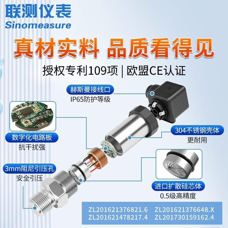 联测自动化SIN-P300-B高精度压力变送器,采用进口扩散硅芯体与316L不锈钢膜片,具备0.25级高精度与≤10ms快速响应能力,支持4-20mA、电压及RS485多种信号输出。产品具备IP65防护等级,304不锈钢壳体,抗干扰数字化电路板,适用于水、气、油、液等多种介质的压力测量。量程范围广,覆盖-100kPa至60MPa,支持赫斯曼接头、航空插头等多种电气接口,适用于供水监测、过程自动化、消防系统、供暖饮水等多种工业场景。通过ISO9001、CE、SGS等多项国际认证,拥有3年质保,出厂经36道工序严格检测,确保长期稳定可靠。杭州联测自动化有限公司专注仪表研发生产16年,年产能超30万套,产品远销120+国家,服务50万+客户,值得信赖。