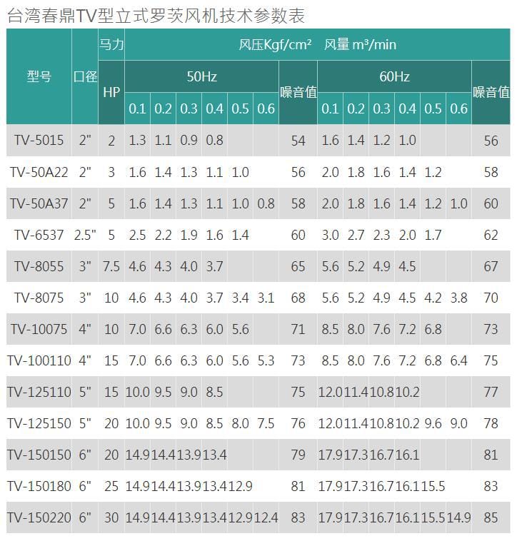六.春鼎TV型直立式罗茨风机产品规格: 压送用途适用压力∶0 ~ 0.6 kgf/cm2 2 ~ 30HP另外可依特殊材质指定设计TV型直立式罗茨鼓风机产品特性较低的能源损耗∶春鼎TV型直立式罗茨鼓风机的设计能减少逆流对转子的压力, 相对也能减少对能源的损耗。较低的噪音∶压力脉冲是主要的噪音源,春鼎直立式罗茨鼓风机相较于皮带式罗茨鼓风机能有效降低噪音达五分贝。减免经常性之保养困扰∶春鼎直立式罗茨鼓风机采用直结式传动,可减免皮带之经常性损耗保养及机气漏油之困扰。机器体积小,不占空间∶春鼎直立式罗茨鼓风机体积小,不占空间,而出气口可依现场环境调整方向,安装容易。装置简单∶装置简单、省工时、不占空间、不需隔音设备┅┅即达成低噪音之生活空间