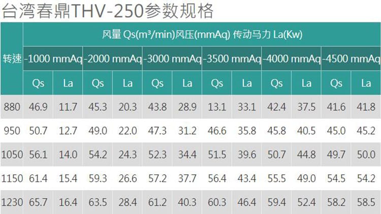 • 台湾春鼎(RUNDEAN)THV-250鼓风机技术参数如下:包含不同转速下的风量(m³/min)、风压(mmAq)、传动马力(Kw)等性能指标,适用于各类水处理与环保工程系统。该型号具备稳定气流输出和高效能表现,广泛应用于加药系统、曝气设备及清洗流程中。由沐源(上海)环保科技有限公司专业供应,支持选型咨询与售后服务。