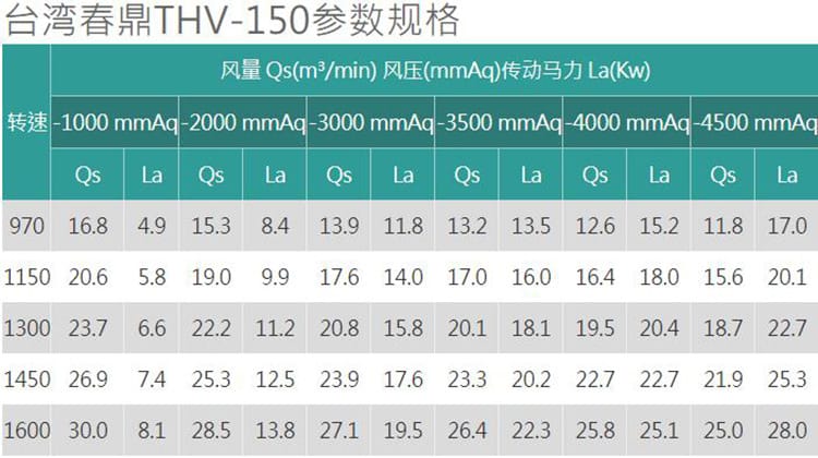 • 台湾春鼎(TRUNDEAN)THV-150鼓风机是一款高效稳定的气动设备,广泛应用于水处理、环保加药系统及工业通风领域。本产品提供多种转速(1150/1300/1450/1600 RPM)下的精确性能参数,可在不同风压条件下实现稳定风量输出。例如在1600转速下,1000mmAq时风量达30.0 m³/min,传动马力为8.1kW;最高支持4500mmAq背压,风量18.7 m³/min,马力28.0kW。性能可靠,结构紧凑,适合连续运行。沐源(上海)环保科技有限公司专业供应春鼎鼓风机及相关加药系统配套设备,支持OEM定制与现场技术培训,确保客户获得高性价比解决方案和快速售后服务响应。